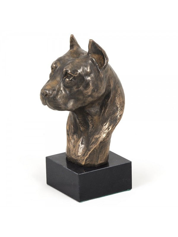 Handgjord American staffordshire terrier-figurin i kallstöpt brons med interiör i stark kvarts ståendes på marmor i begränsad upplaga.