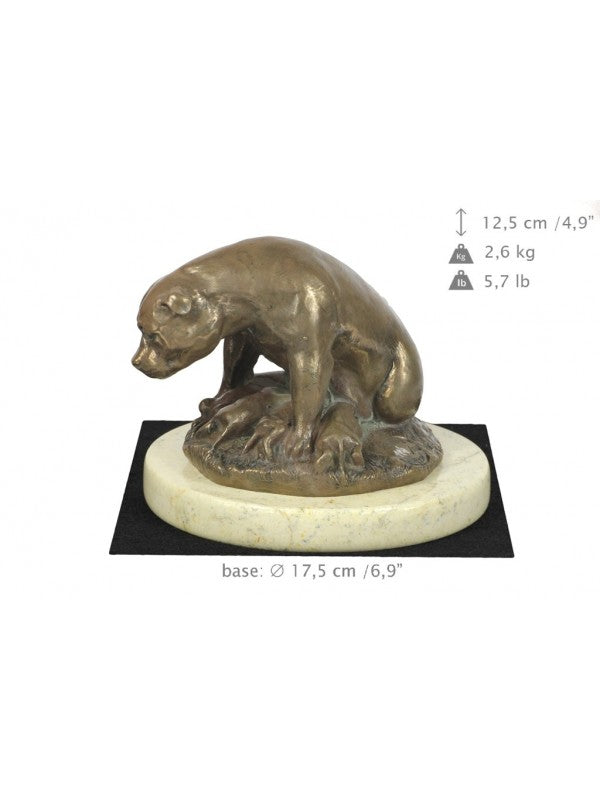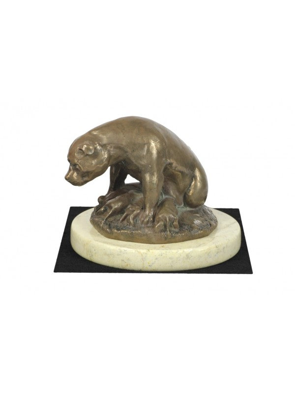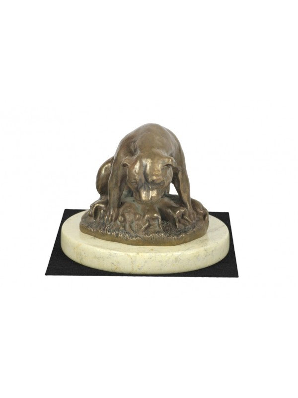 Handgjord American staffordshire terrier-statyetti kallstöpt brons med interiör i stark kvarts ståendes på sandmarmor i begränsad upplaga.
