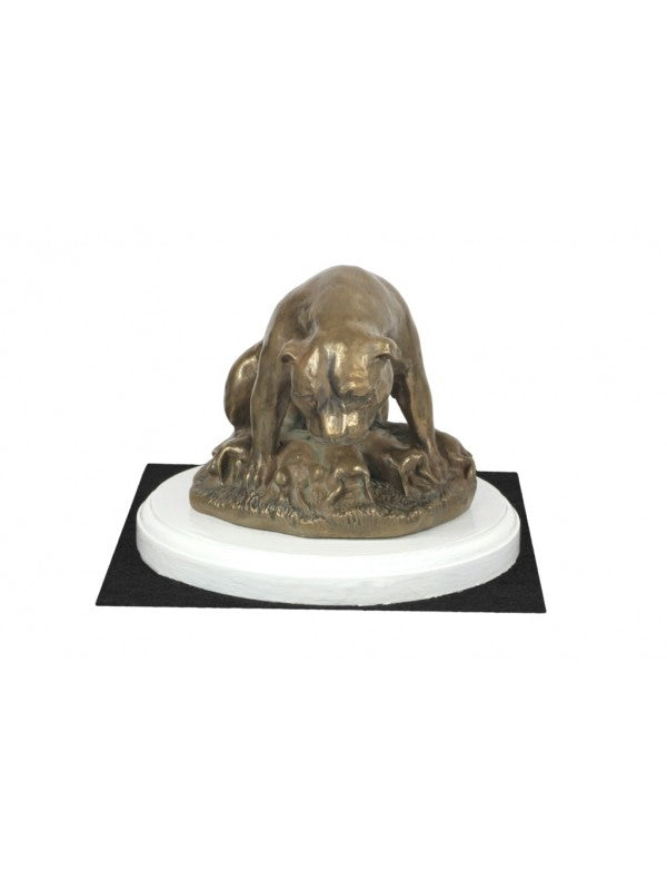 Handgjord American staffordshire terrier-statyett i i äkta brons med interiör i stark kvarts ståendes på träbas i begränsad upplaga.