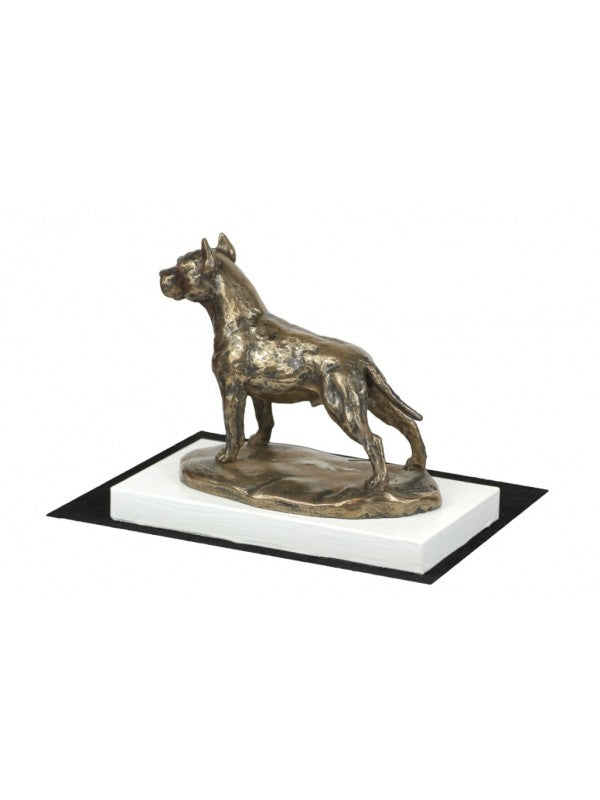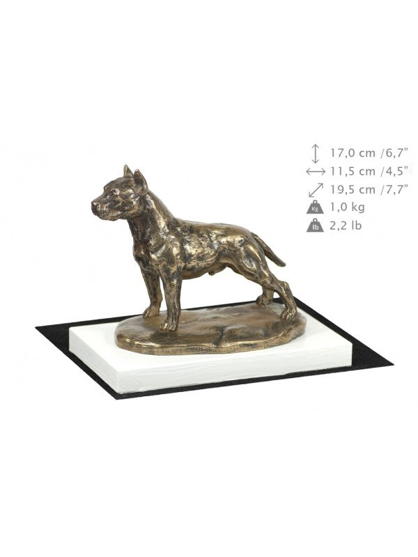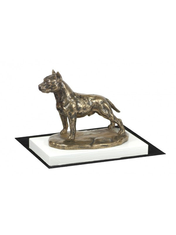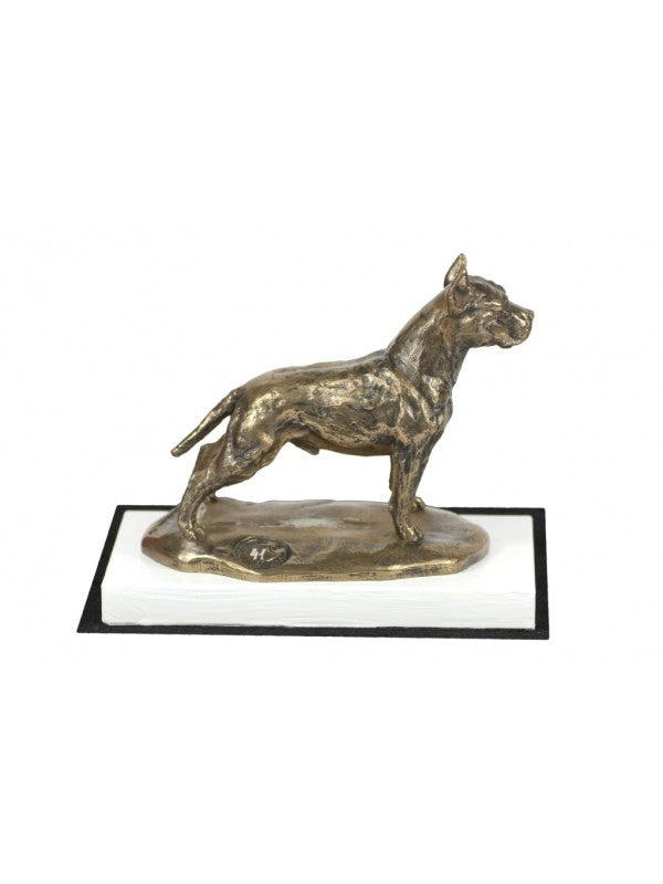 Handgjord American staffordshire terrier-statyett i i äkta brons med interiör i stark kvarts ståendes på träbas i begränsad upplaga.