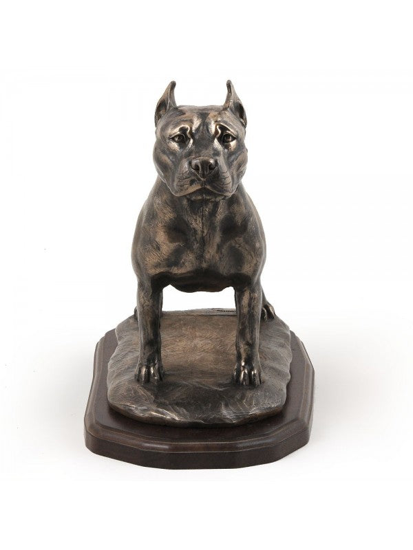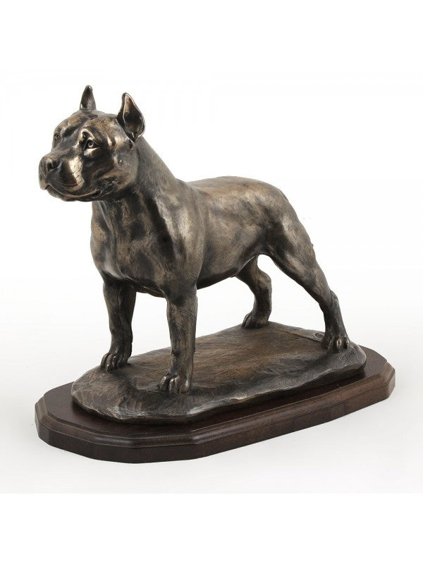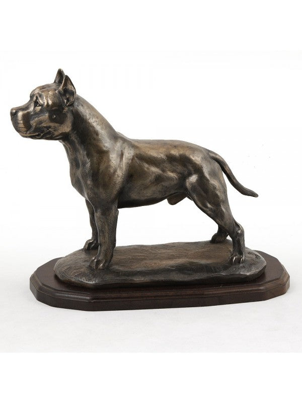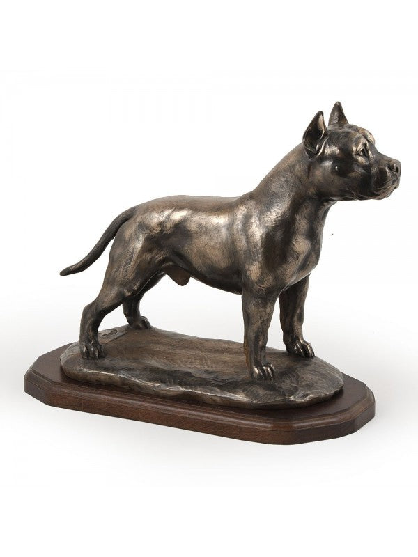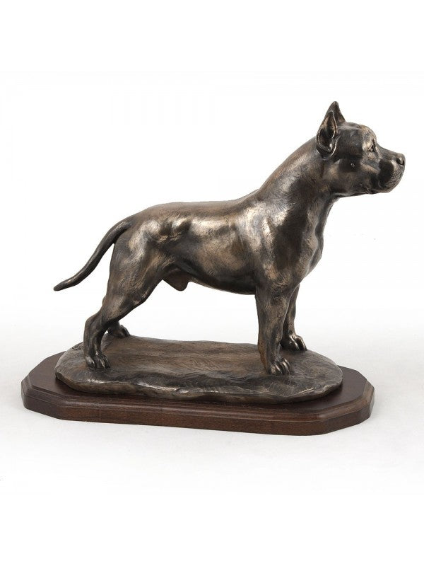 Handgjord American staffordshire terrier-statyett i kallstöpt brons med interiör i stark kvarts ståendes på träbas i begränsad upplaga.