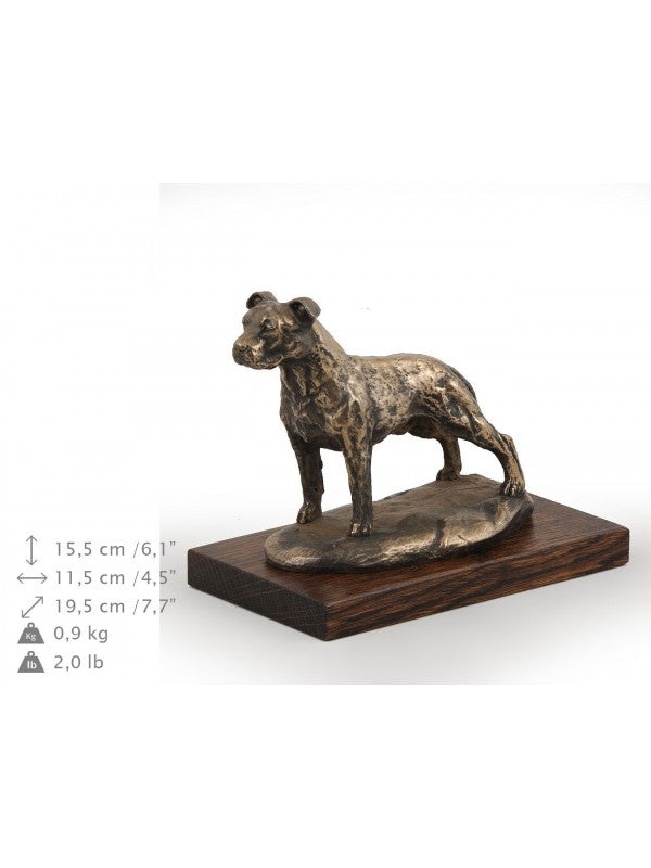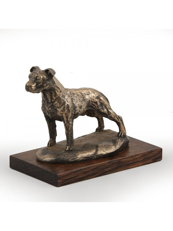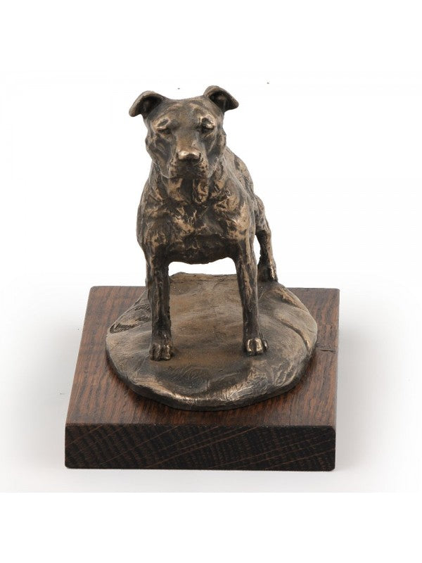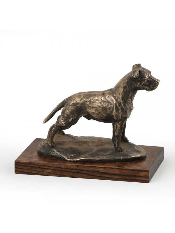 Handgjord American staffordshire terrier-statyetti kallstöpt brons med interiör i stark kvarts ståendes på bas i trä i begränsad upplaga.