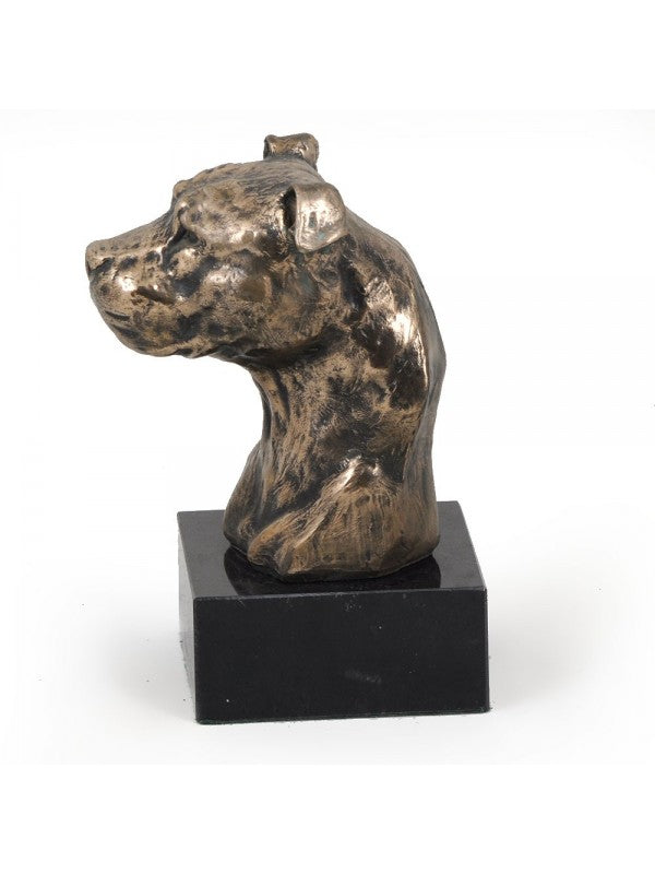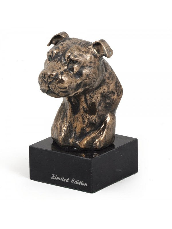 Handgjord Amstaff-figurin i kallstöpt brons med interiör i stark kvarts ståendes på marmor i begränsad upplaga.