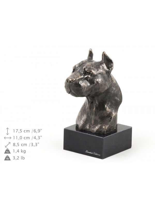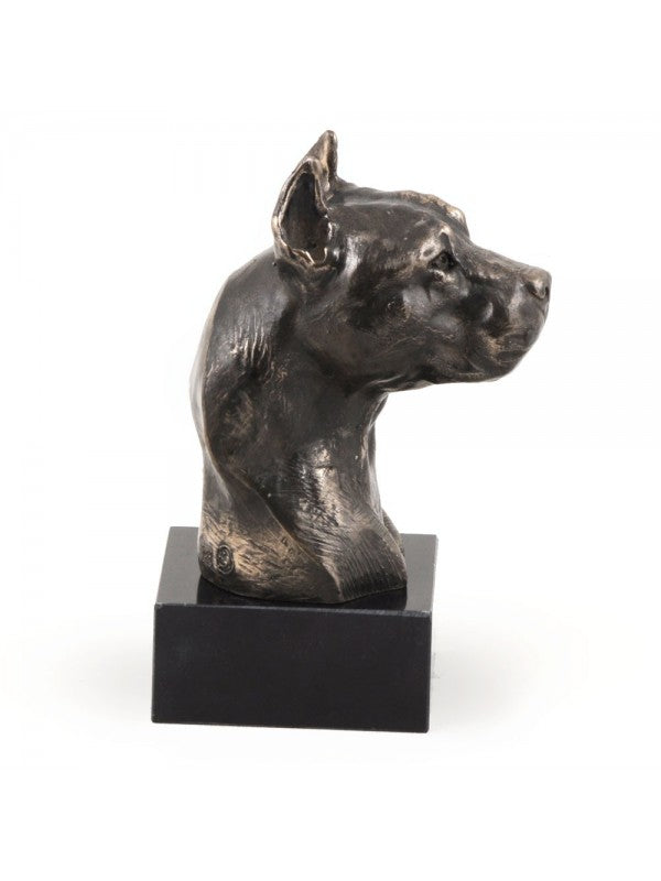 Handgjord Amstaff-figurin i kallstöpt brons med interiör i stark kvarts ståendes på marmor i begränsad upplaga.