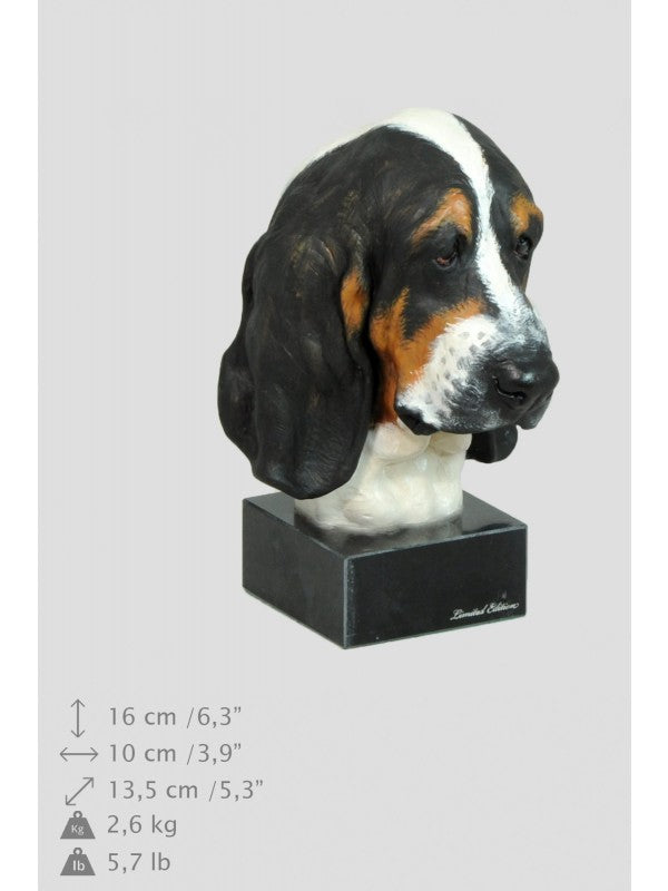 Handgjord Basset hound-figurin i kallstöpt brons med interiör i stark kvarts ståendes på marmor i begränsad upplaga.