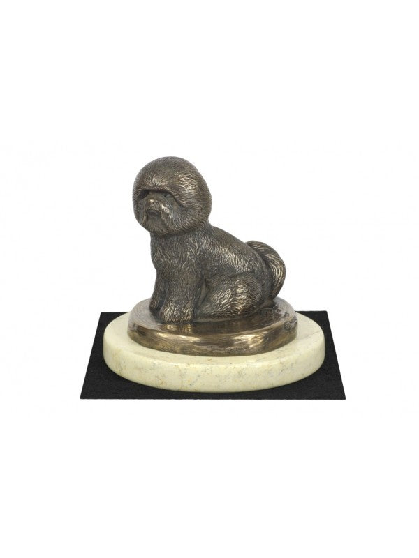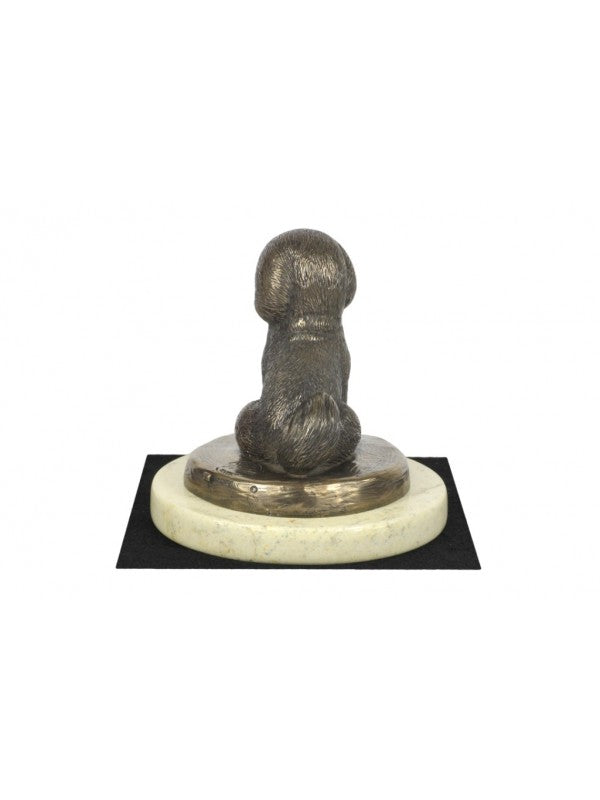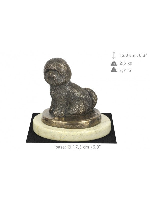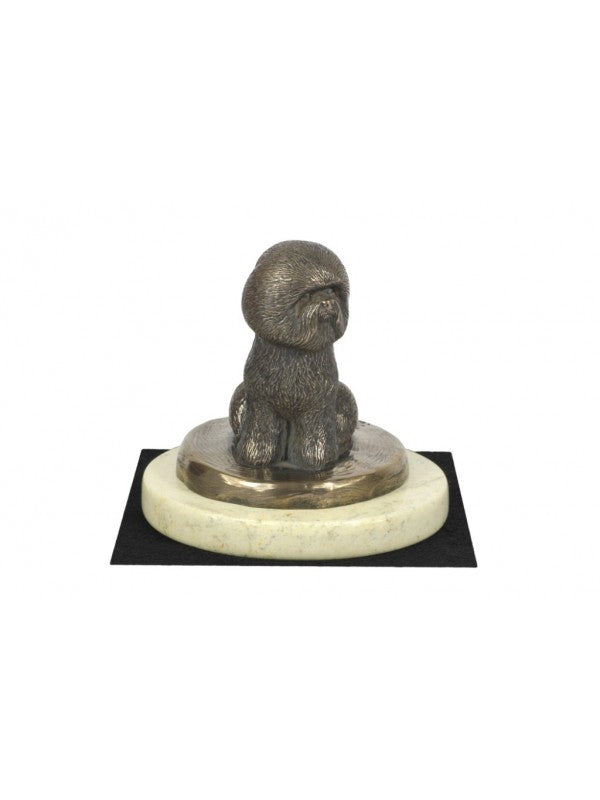 Handgjord Bichon Frise-statyetti kallstöpt brons med interiör i stark kvarts ståendes på sandmarmor i begränsad upplaga.