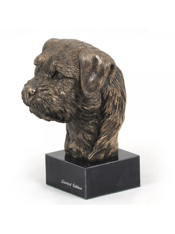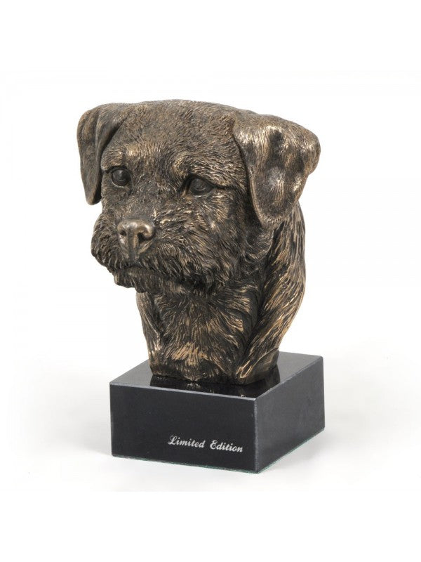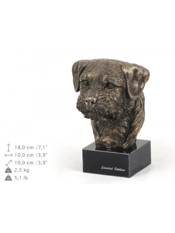 Handgjord Borderterrier-figurin i kallstöpt brons med interiör i stark kvarts ståendes på marmor i begränsad upplaga.
