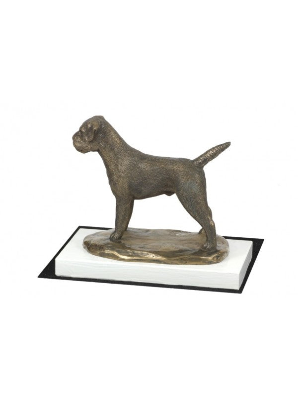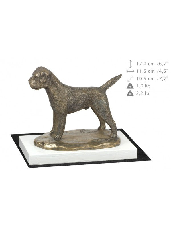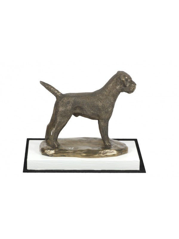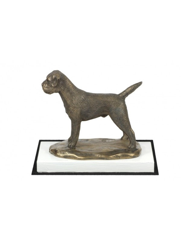 Handgjord Borderterrier-statyett i i äkta brons med interiör i stark kvarts ståendes på bas i vitt trä i begränsad upplaga.