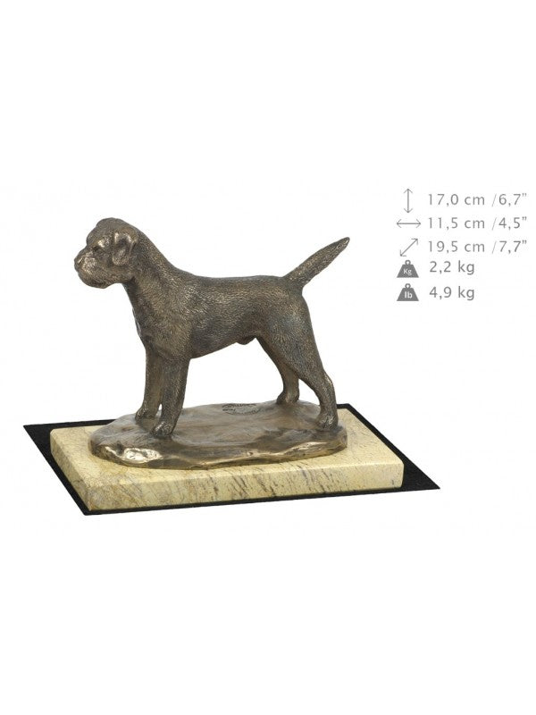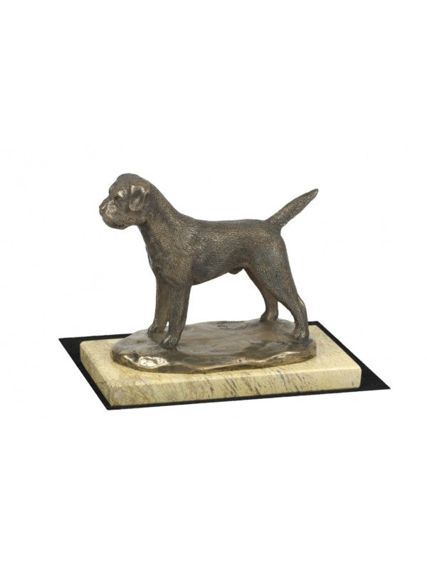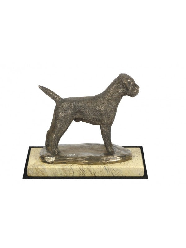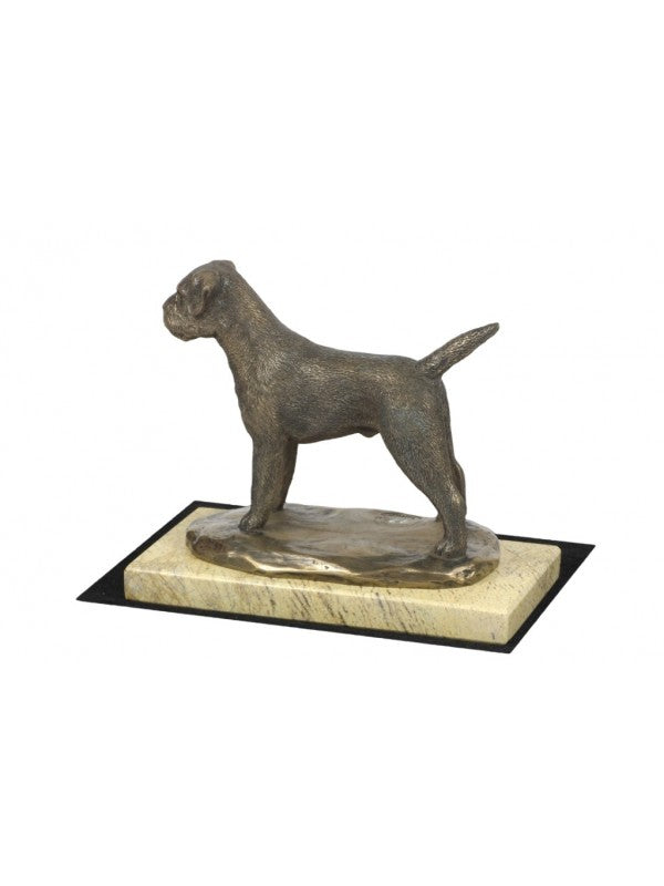 Handgjord Borderterrier-statyetti kallstöpt brons med interiör i stark kvarts ståendes på sandmarmor i begränsad upplaga.