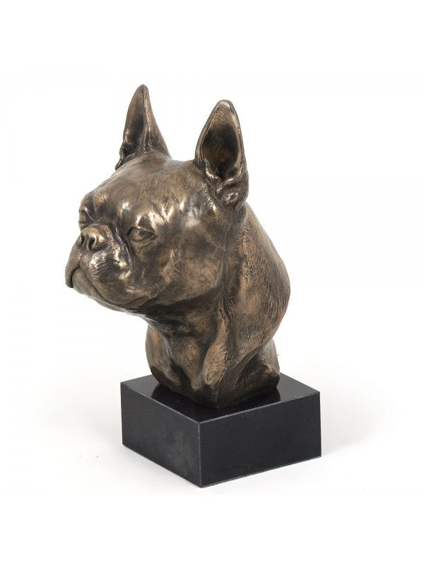 Handgjord Bostonterrier-figurin i kallstöpt brons med interiör i stark kvarts ståendes på marmor i begränsad upplaga.
