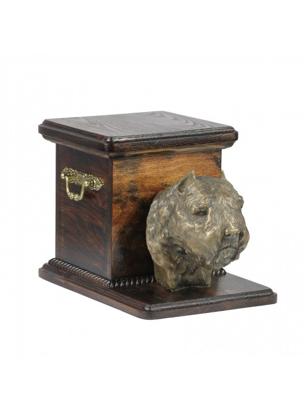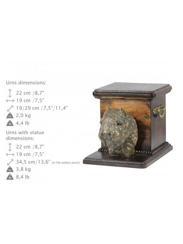 Handgjord Bouvier des Flanders-urna i björk med handtag i mässing och avtagbart lock. Noga utvalda kransformade detaljer. Statyett i kallstöpt brons med interiör i stark kvarts.