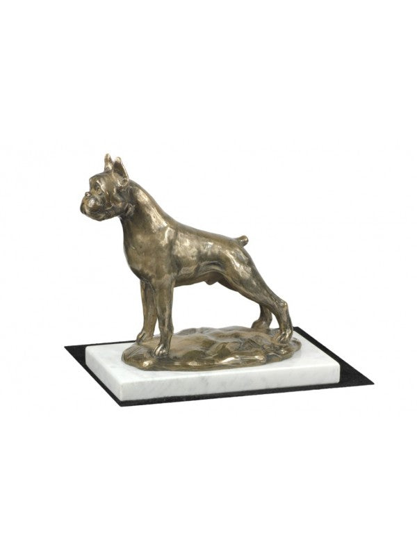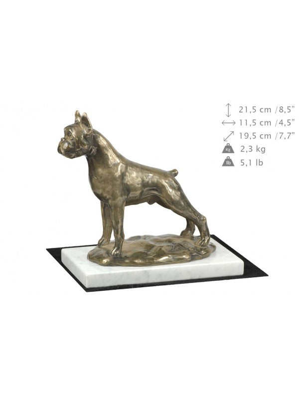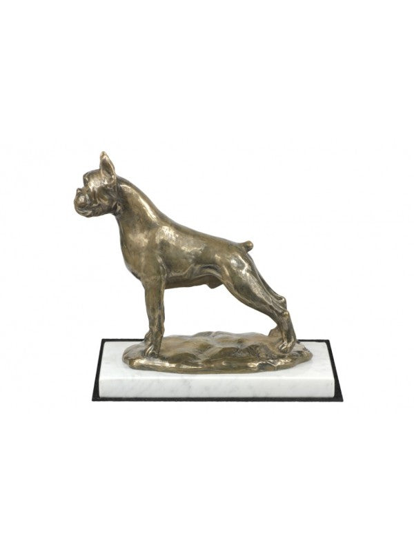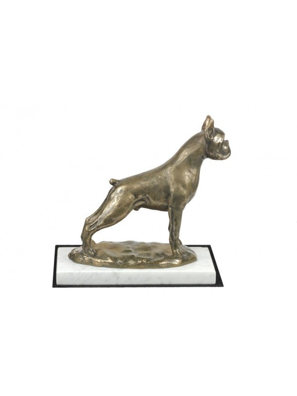 Handgjord Boxer-statyetti kallstöpt brons med interiör i stark kvarts ståendes på vit marmor i begränsad upplaga.