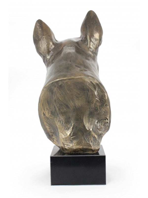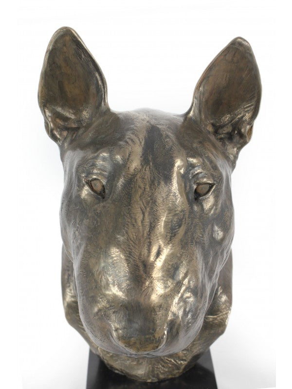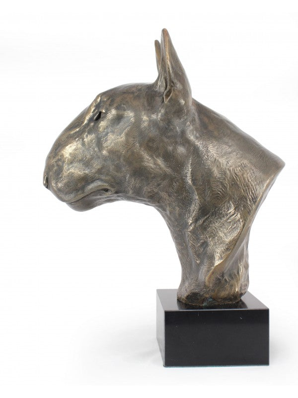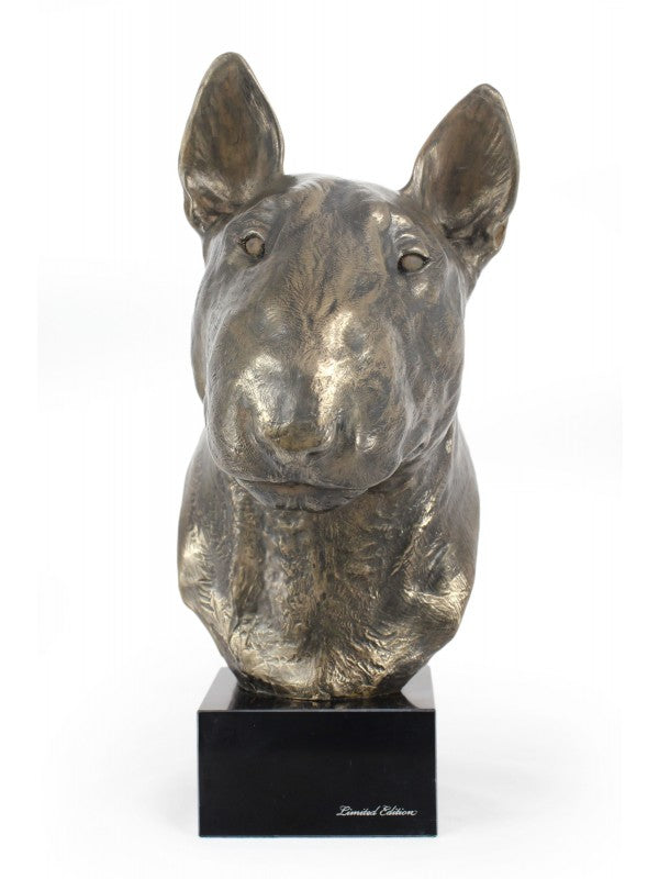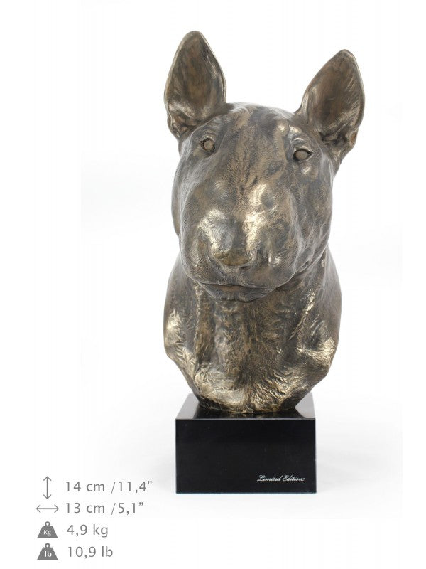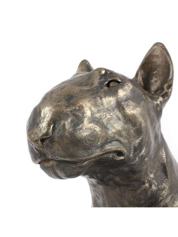 Handgjord Bullterrier-figurin i kallstöpt brons med interiör i stark kvarts ståendes på marmor i begränsad upplaga.