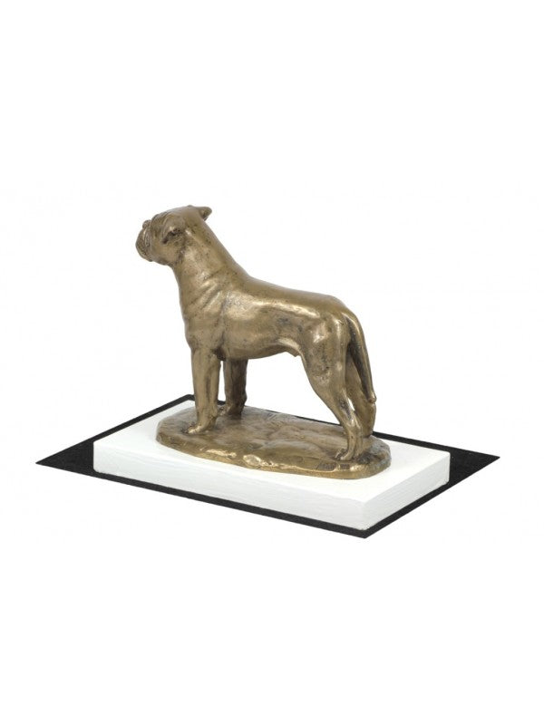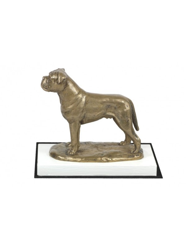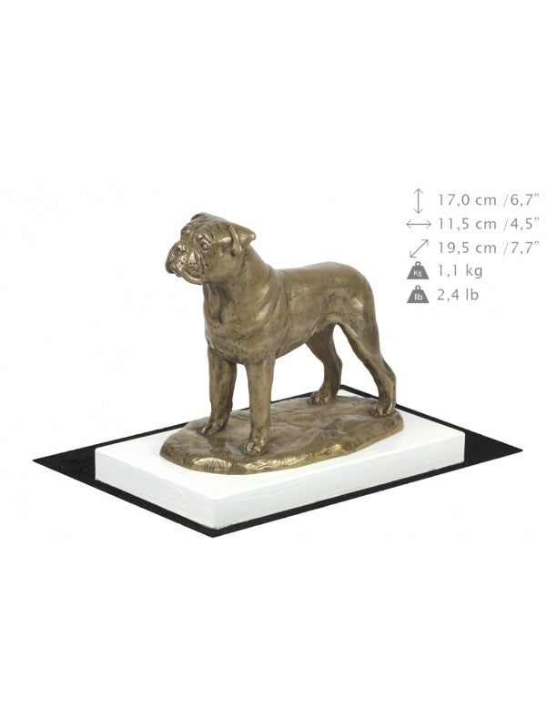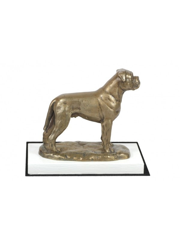 Handgjord Bullmastiff-statyett i kallstöpt brons med interiör i stark kvarts ståendes på bas i vitt trä i begränsad upplaga.