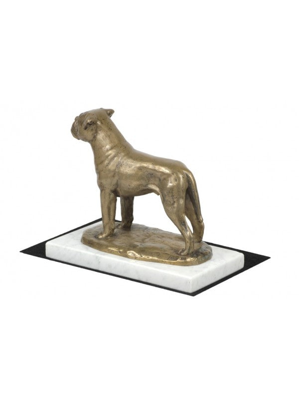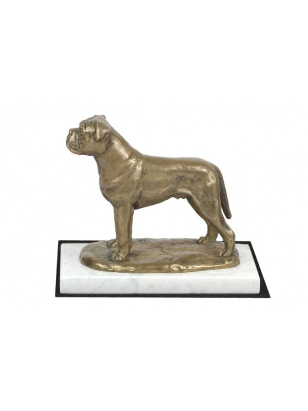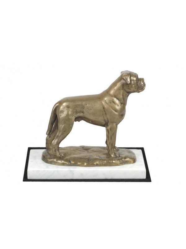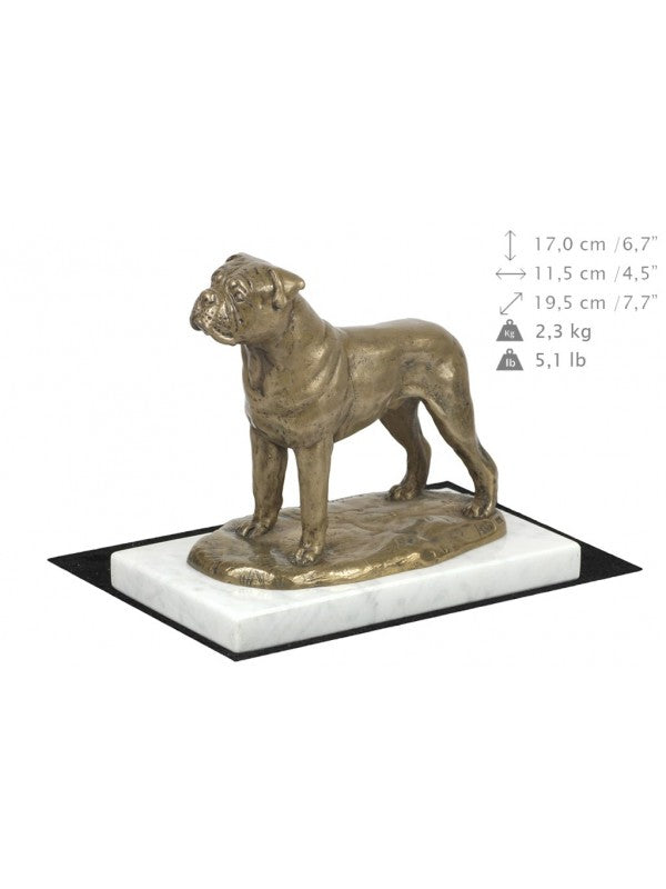 Handgjord Bullmastiff-statyetti kallstöpt brons med interiör i stark kvarts ståendes på vit marmor i begränsad upplaga.