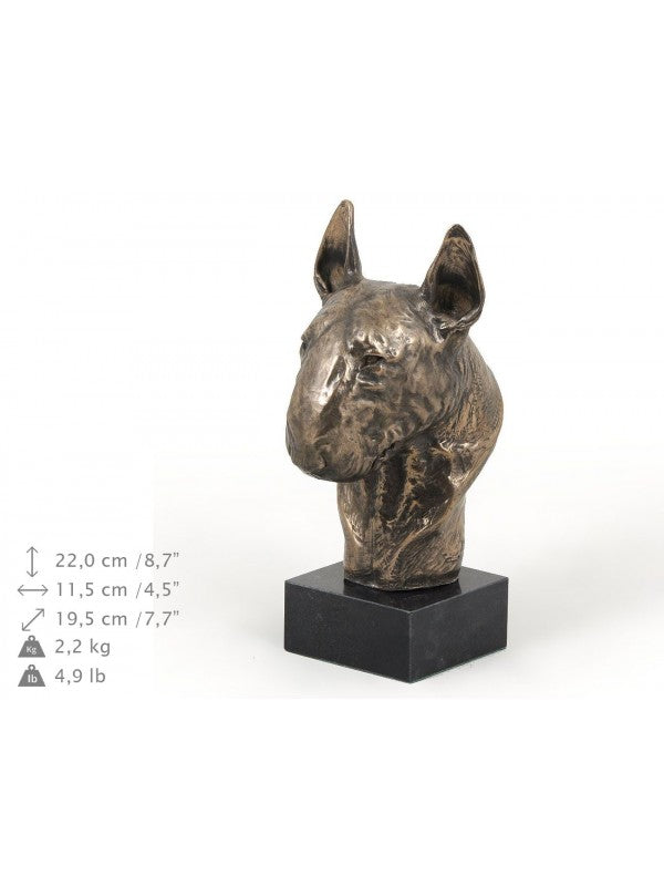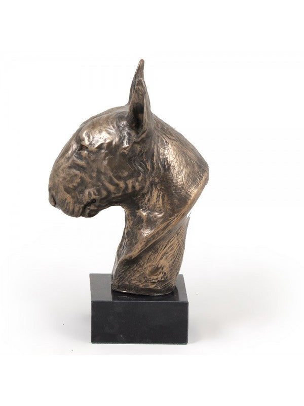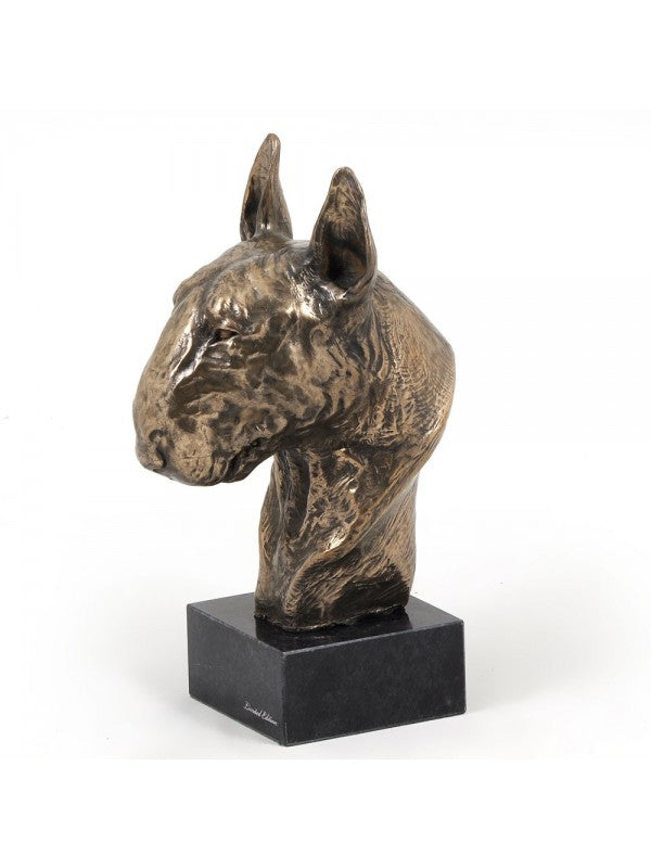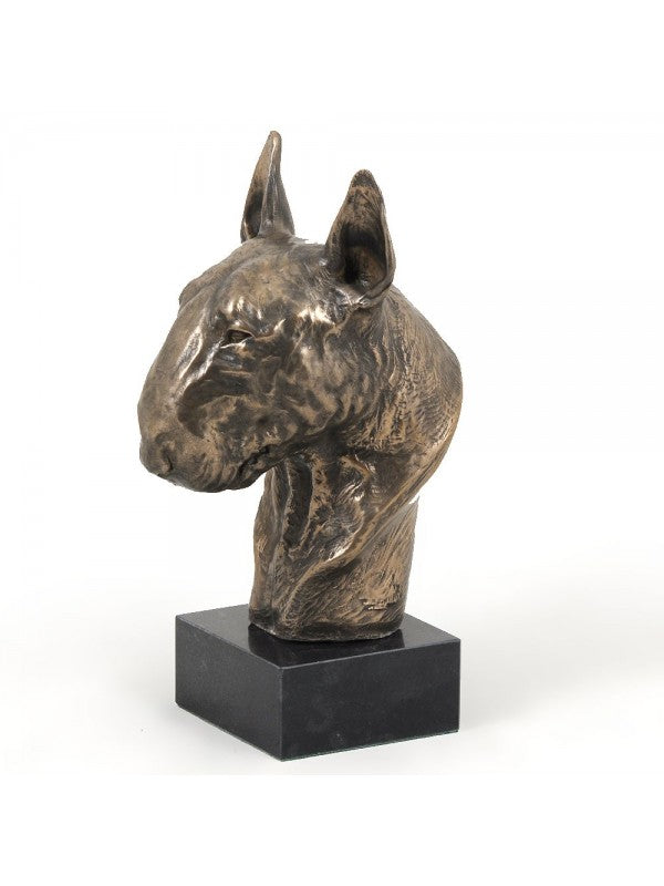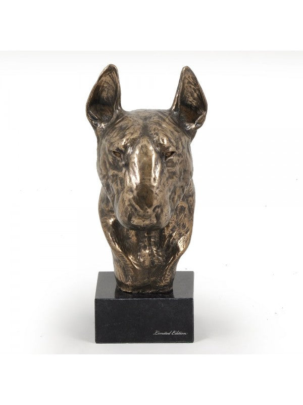 Handgjord Bullterrier-figurin i kallstöpt brons med interiör i stark kvarts ståendes på marmor i begränsad upplaga.