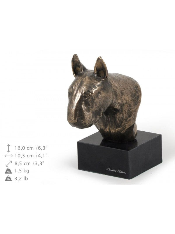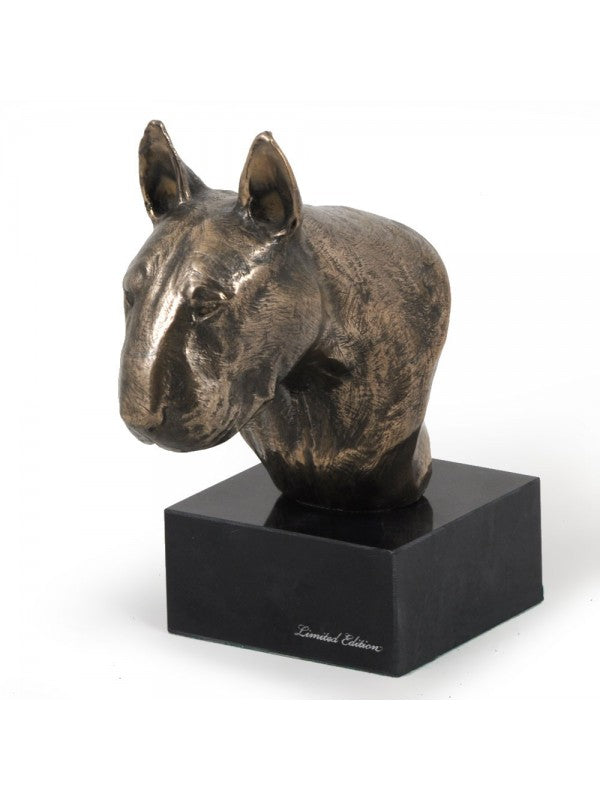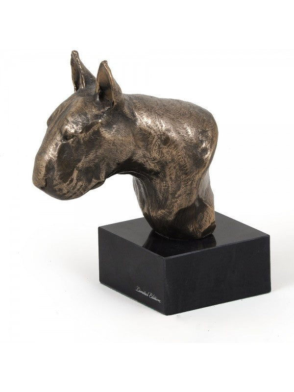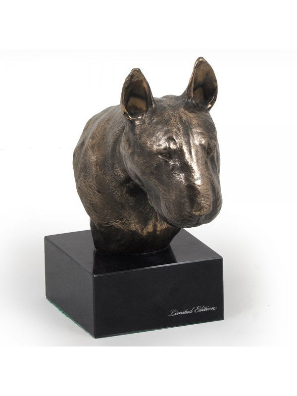 Handgjord Bullterrier-figurin i kallstöpt brons med interiör i stark kvarts ståendes på marmor i begränsad upplaga.
