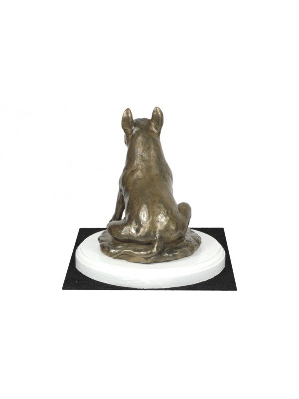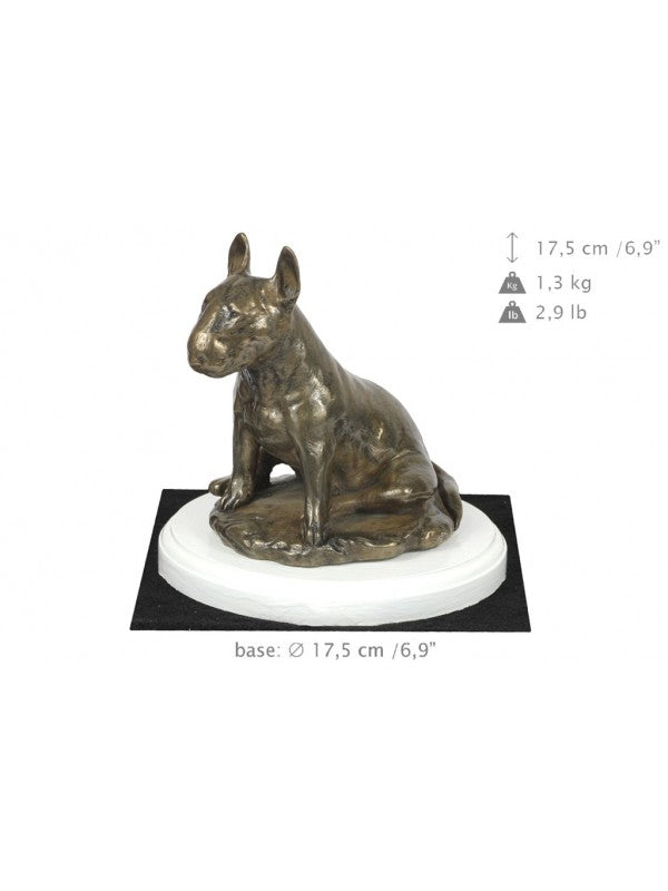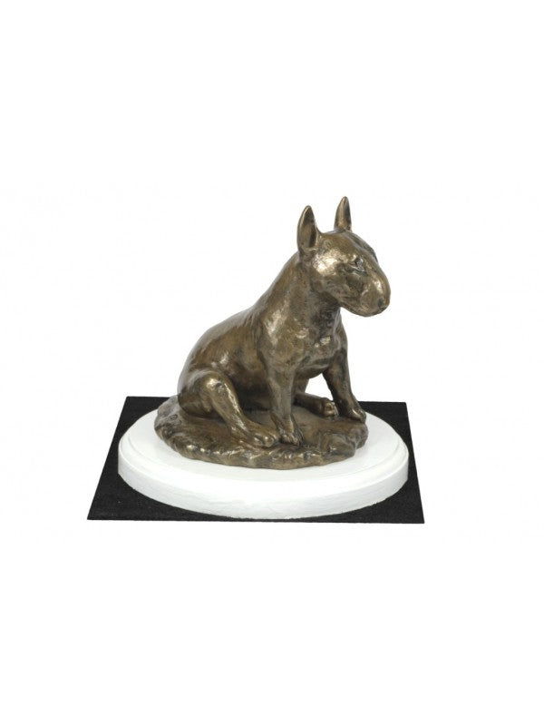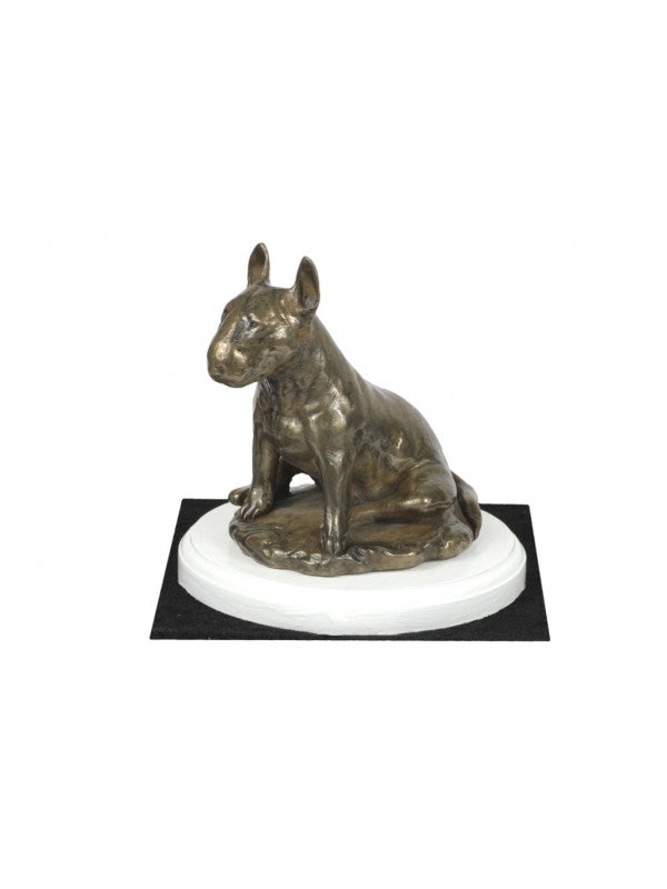 Handgjord Bullterrier-statyett i i äkta brons med interiör i stark kvarts ståendes på bas i vitt trä i begränsad upplaga.