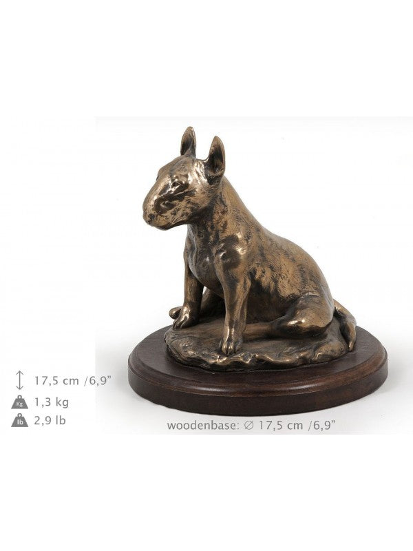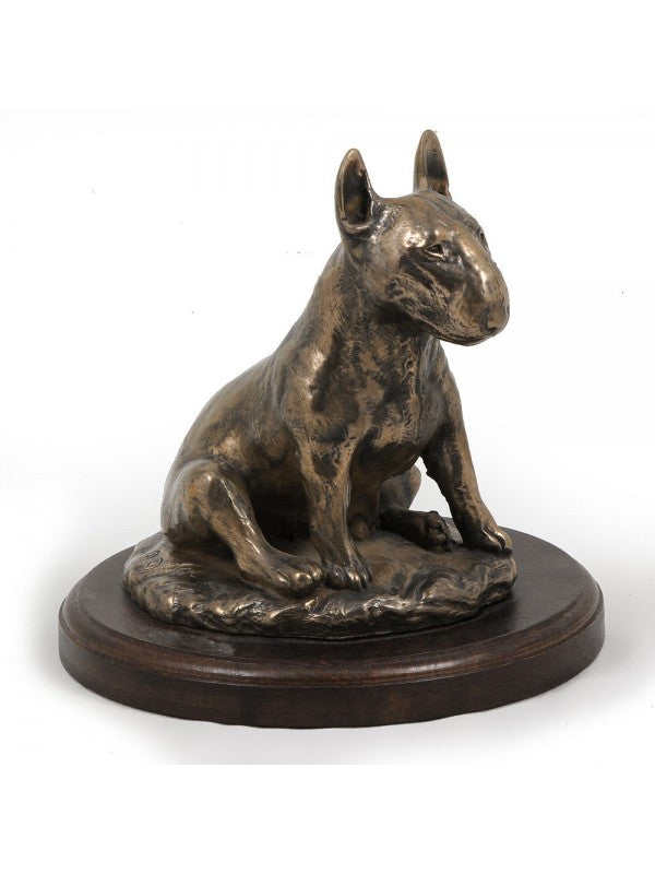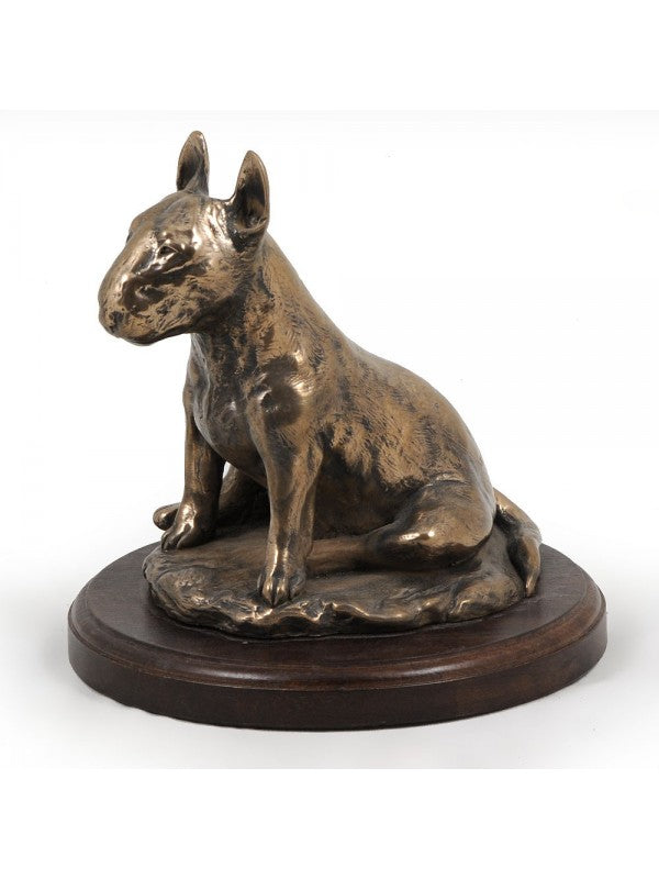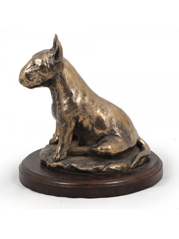 Handgjord Bullterrier-statyetti kallstöpt brons med interiör i stark kvarts ståendes på bas i trä i begränsad upplaga.