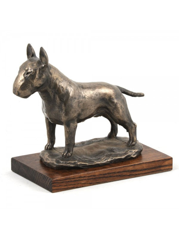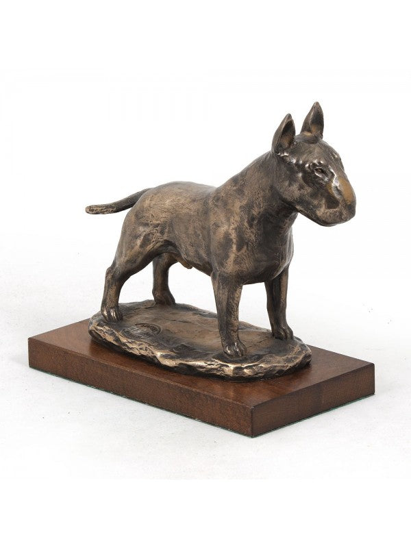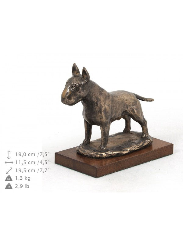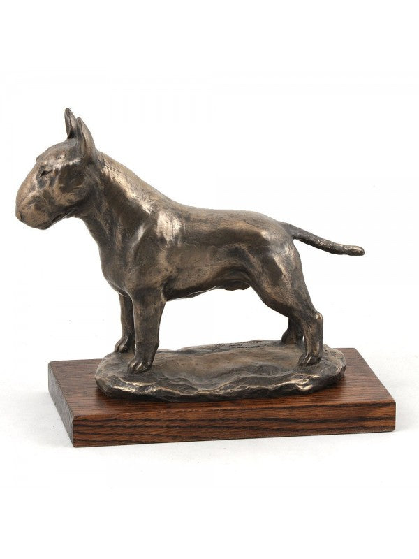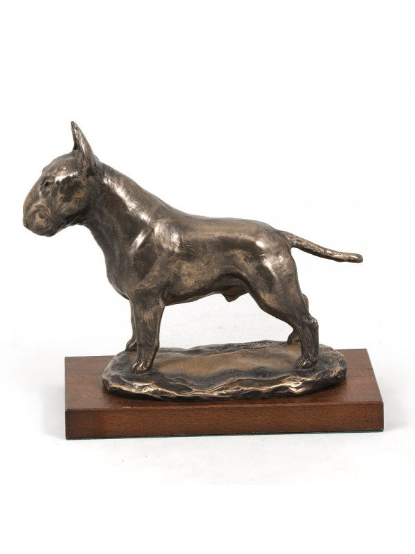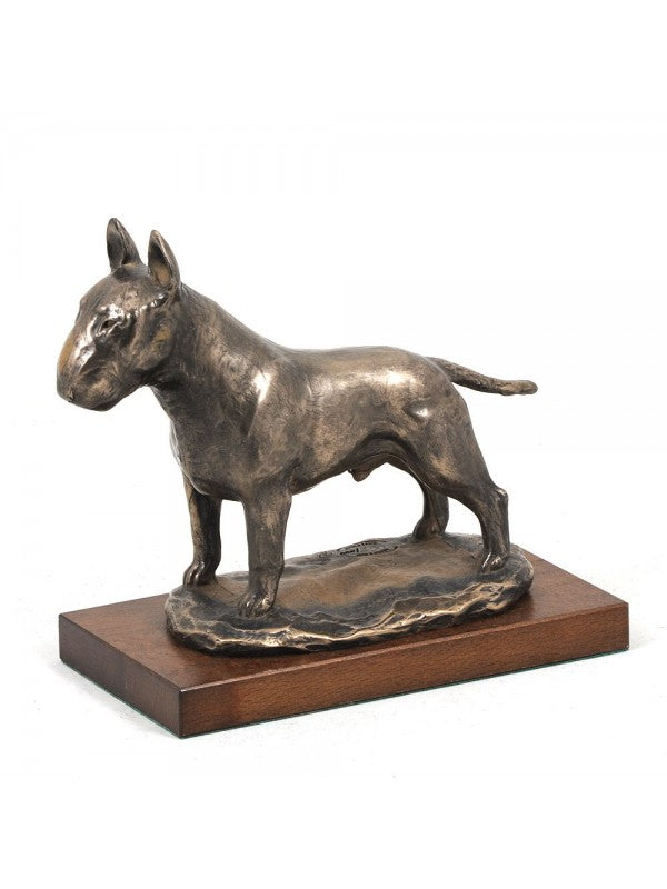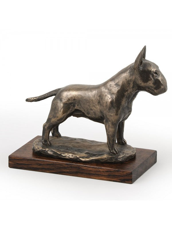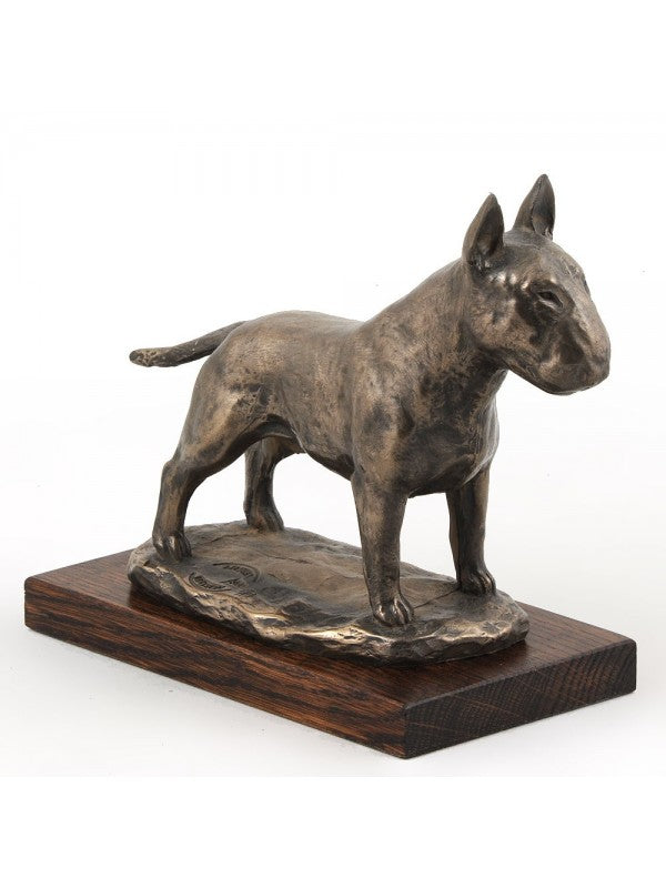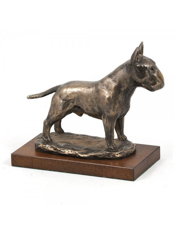 Handgjord Bullterrier-statyetti kallstöpt brons med interiör i stark kvarts ståendes på bas i trä i begränsad upplaga.