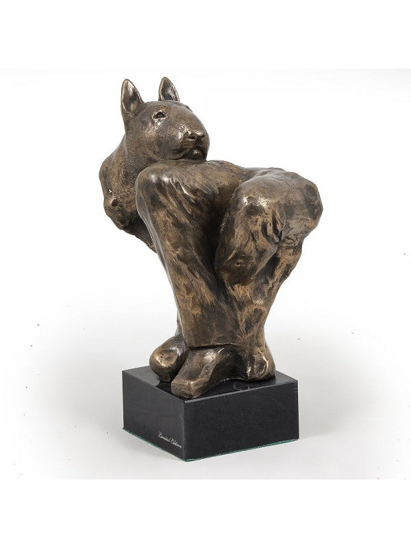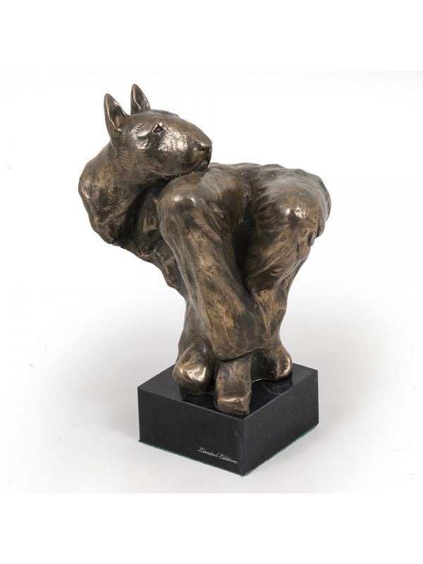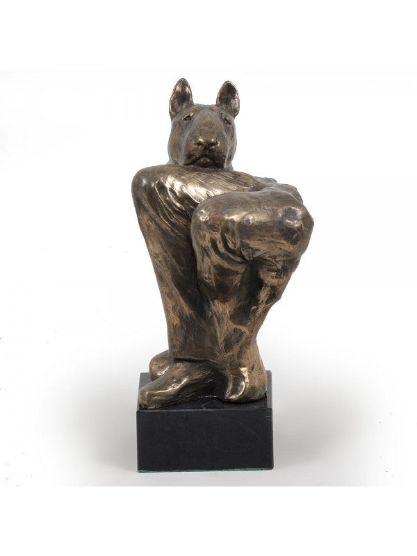 Handgjord Bullterrier-statyetti kallstöpt brons med interiör i stark kvarts ståendes på marmor i begränsad upplaga.