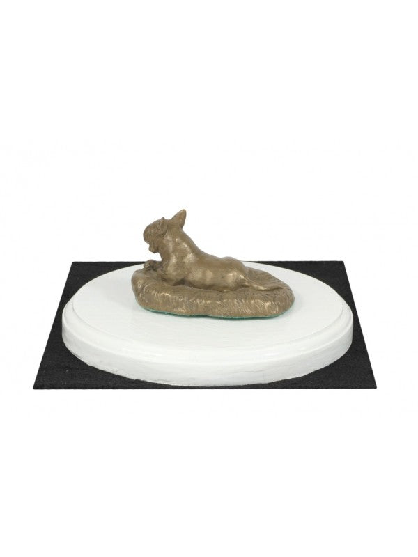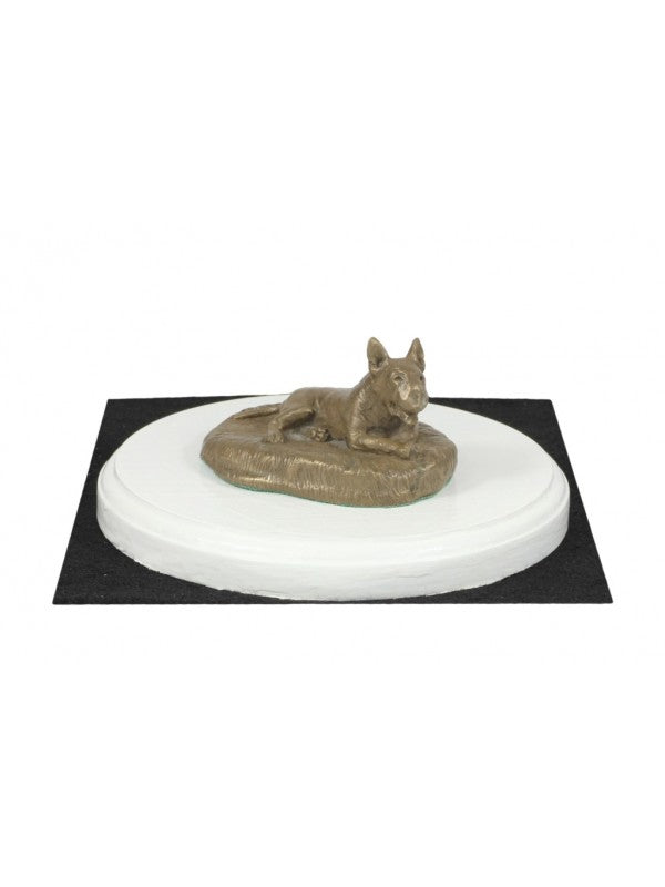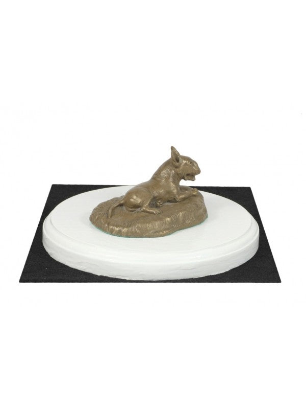 Handgjord Bullterrier-statyett i i äkta brons med interiör i stark kvarts ståendes på bas i vitt trä i begränsad upplaga.