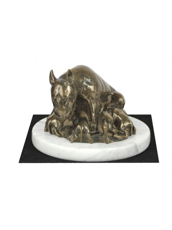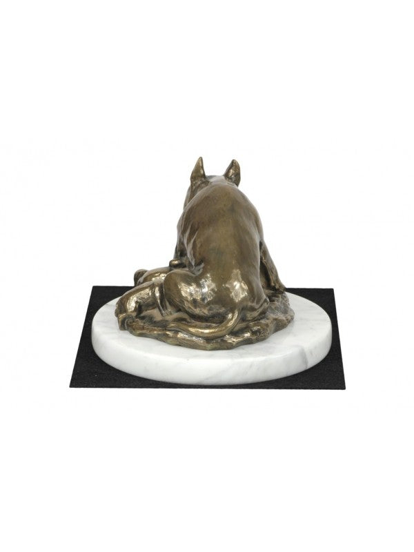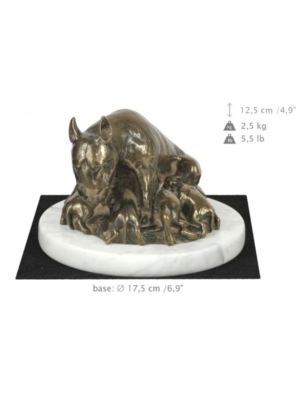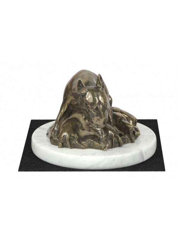 Handgjord Bullterrier-statyetti kallstöpt brons med interiör i stark kvarts ståendes på vit marmor i begränsad upplaga.