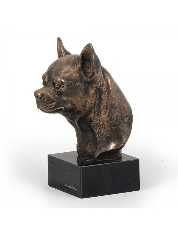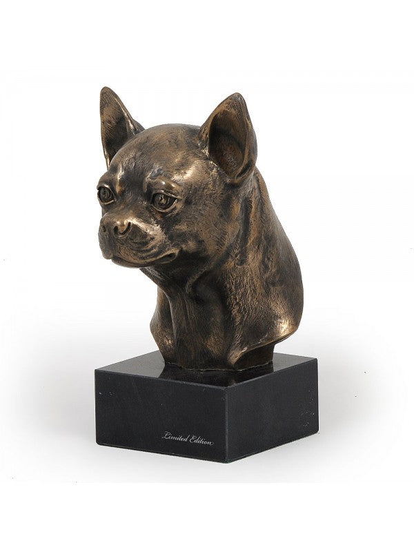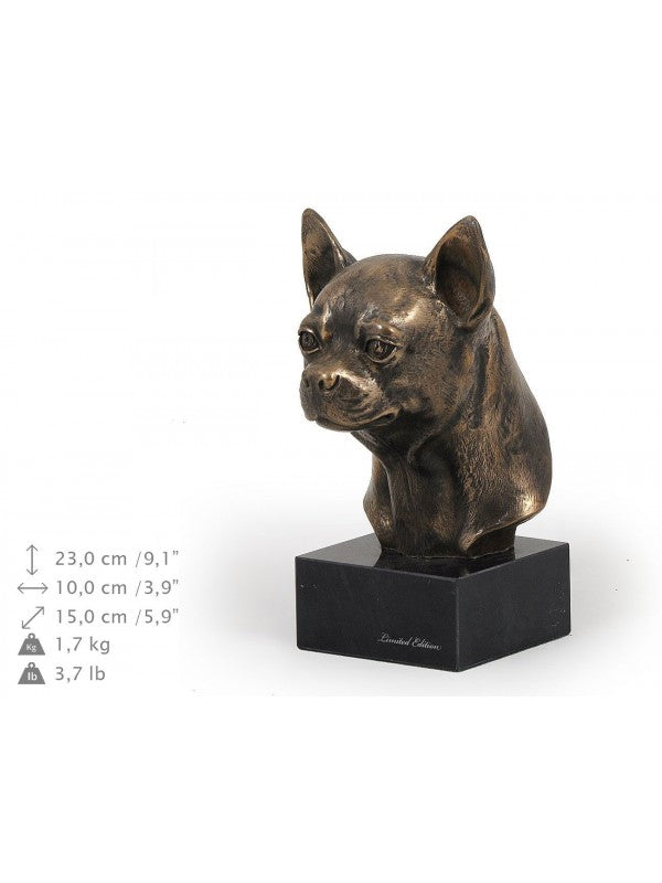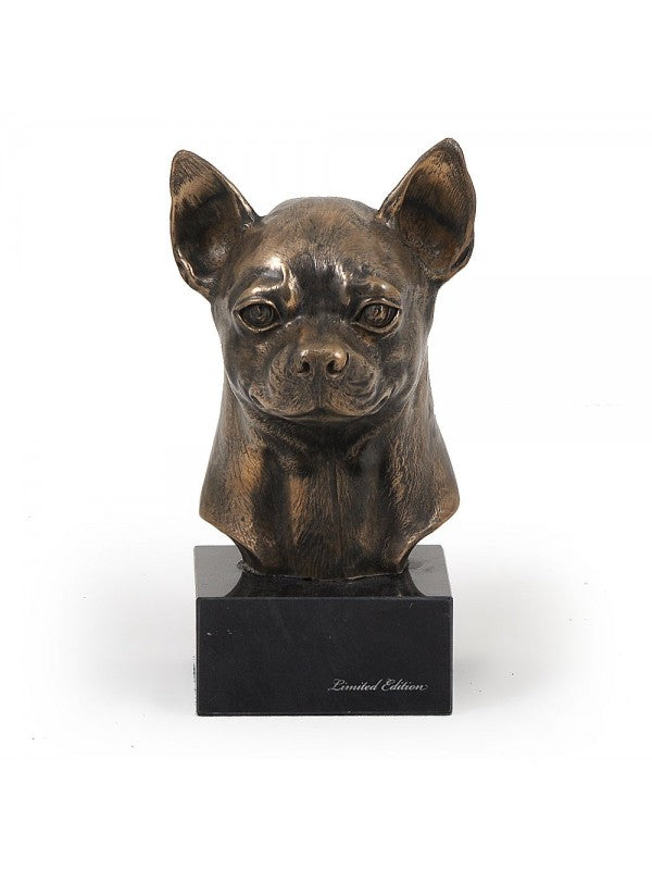 Handgjord Chihuahua korthårig-figurin i kallstöpt brons med interiör i stark kvarts ståendes på marmor i begränsad upplaga.