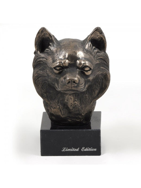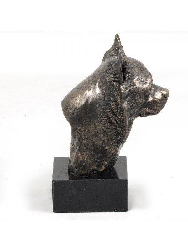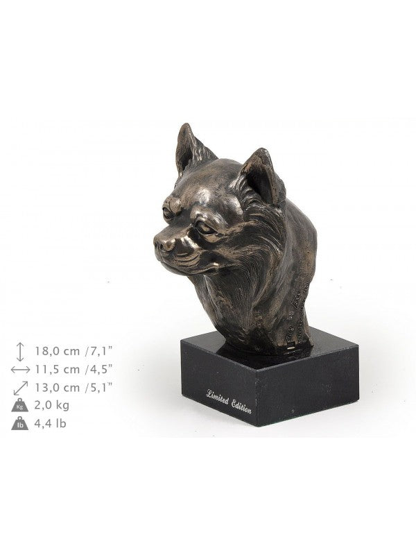 Handgjord Chihuahua långhårig-figurin i kallstöpt brons med interiör i stark kvarts ståendes på marmor i begränsad upplaga.