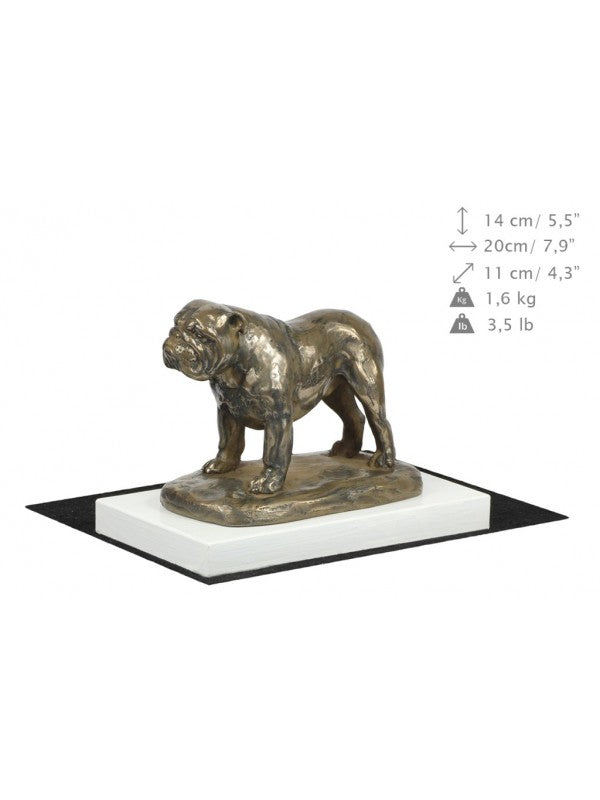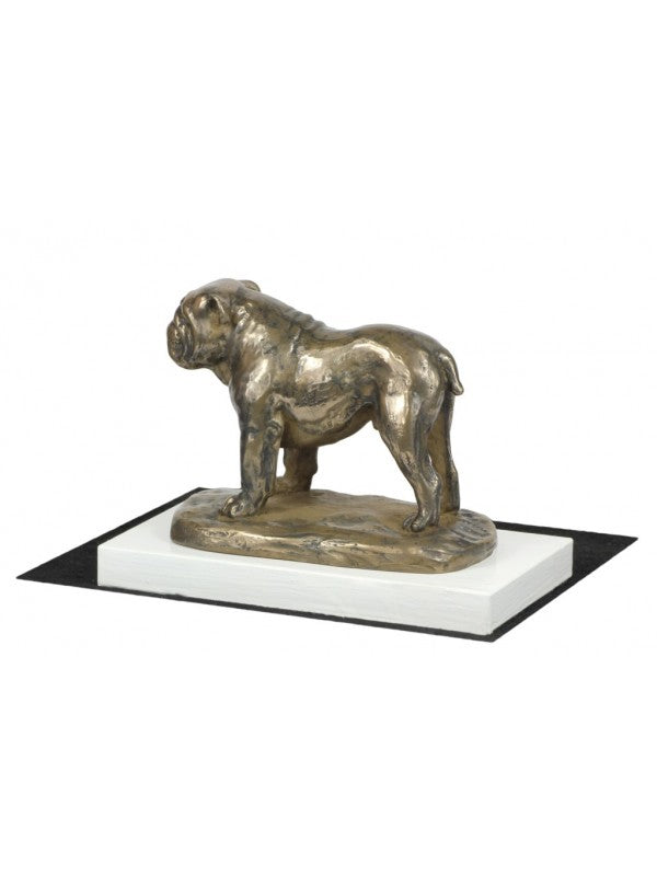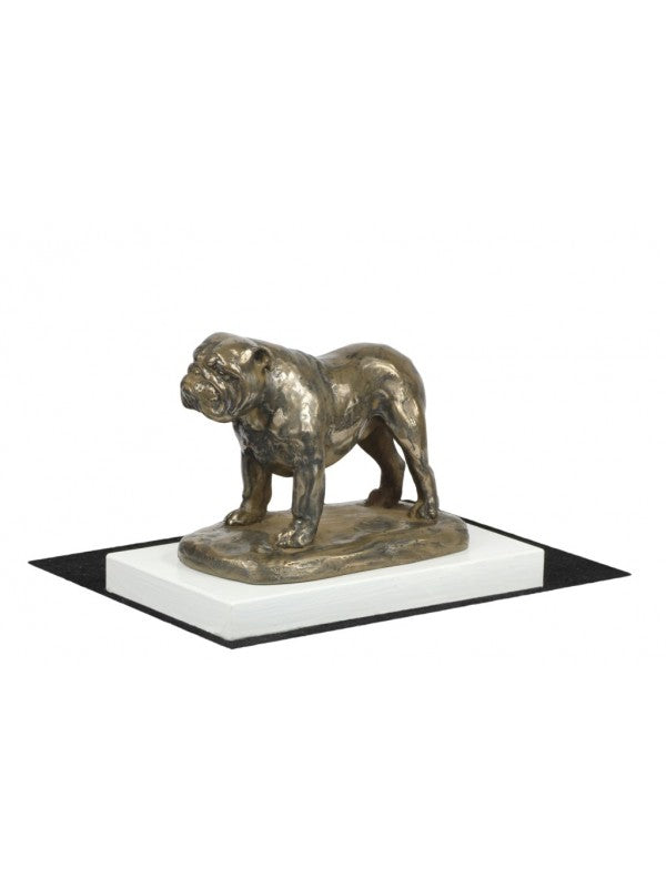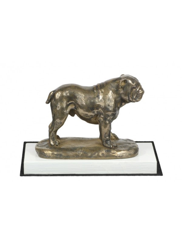 Handgjord Engelsk bulldogg-statyetti kallstöpt brons med interiör i stark kvarts ståendes på bas i vitt trä i begränsad upplaga.