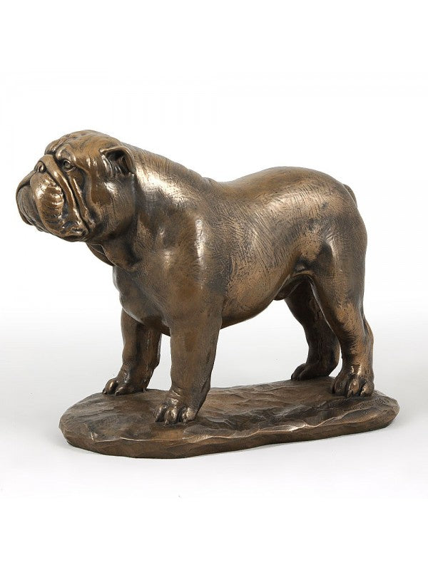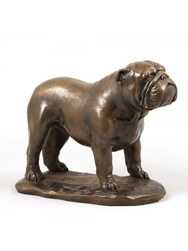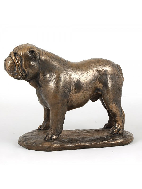 Handgjord Engelsk bulldogg-statyett i kallstöpt brons med interiör i stark kvarts ståendes på bas i trä i begränsad upplaga.