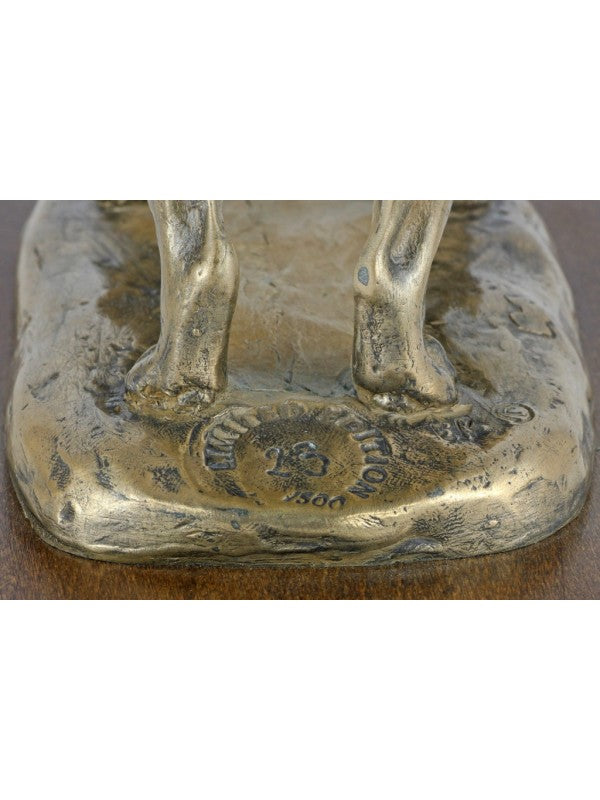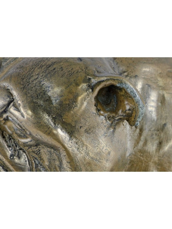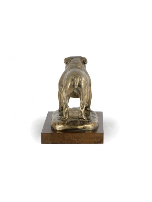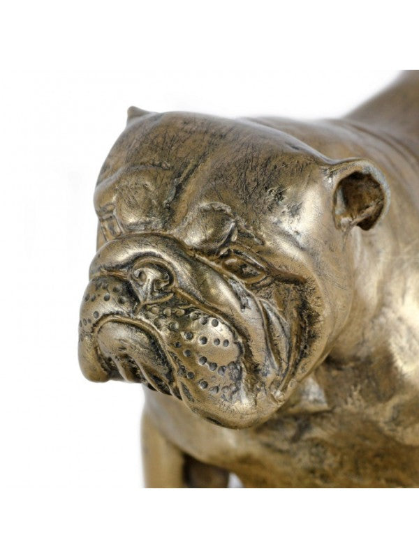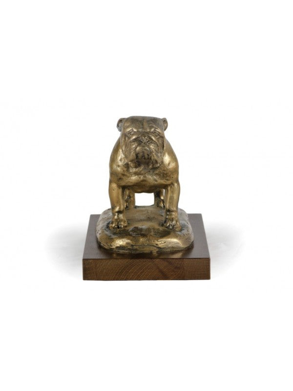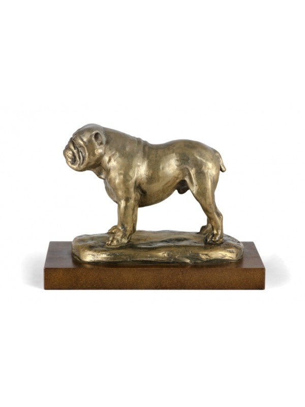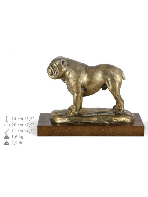 Handgjord Engelsk bulldogg-statyett i i äkta brons med interiör i stark kvarts ståendes på träbas i begränsad upplaga.