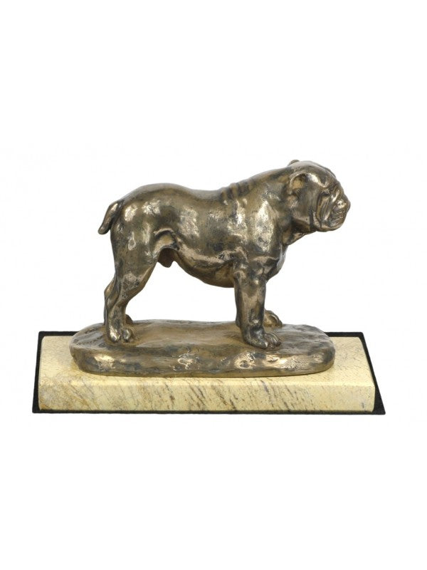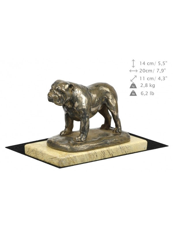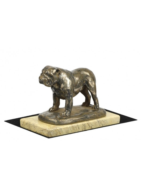 Handgjord Engelsk bulldogg-statyetti kallstöpt brons med interiör i stark kvarts ståendes på sandmarmor i begränsad upplaga.