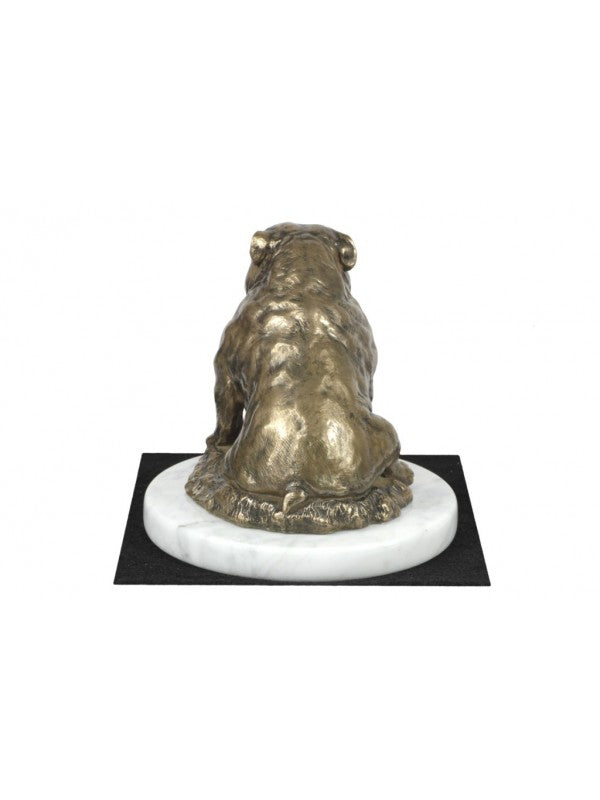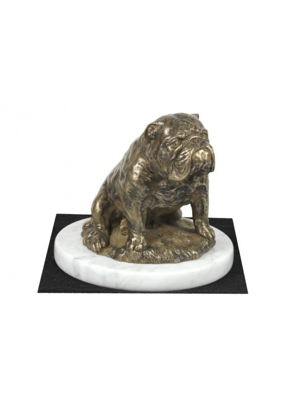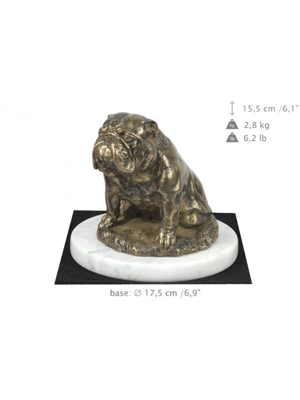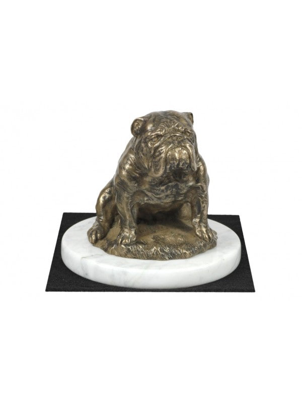 Handgjord Engelsk bulldogg-statyetti kallstöpt brons med interiör i stark kvarts ståendes på vit marmor i begränsad upplaga.