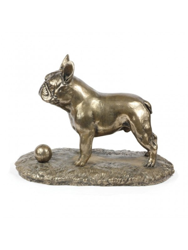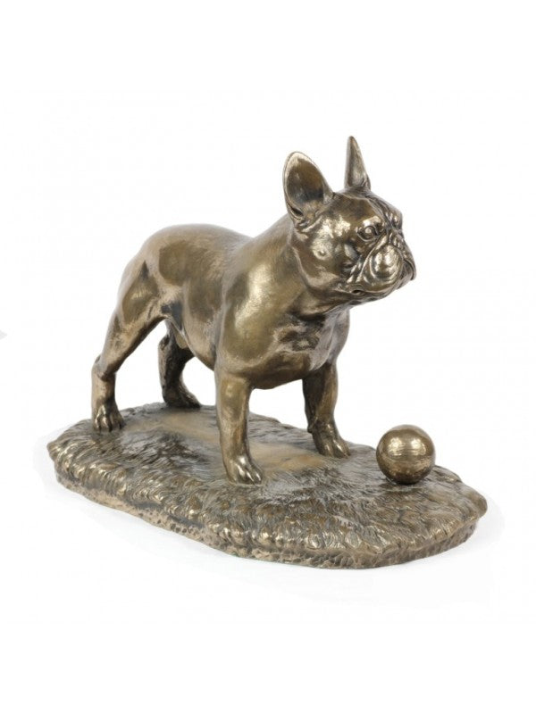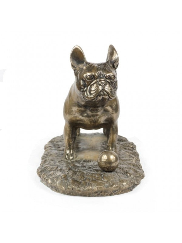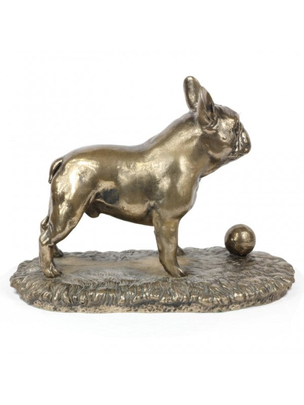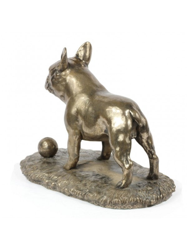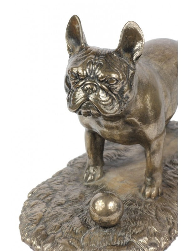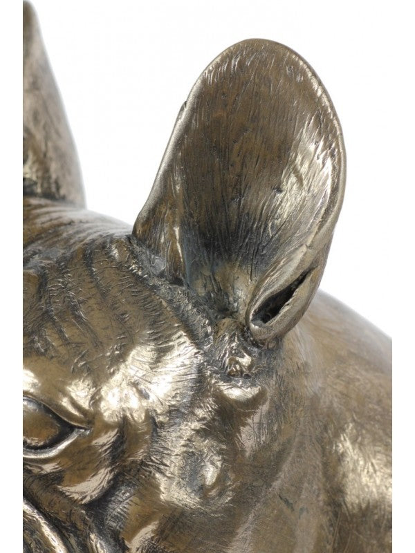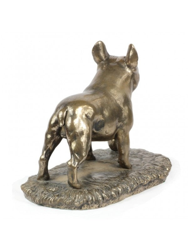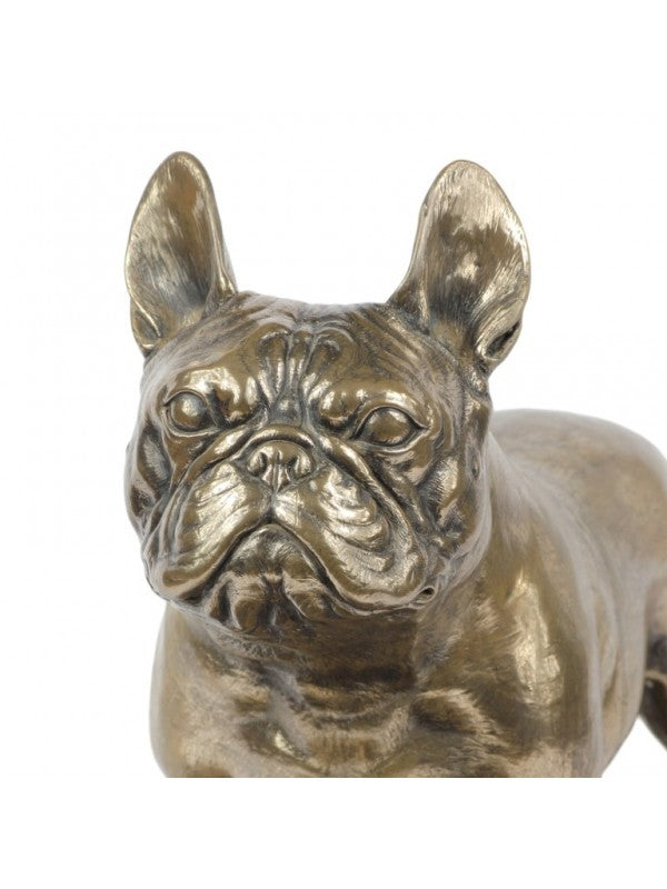 Handgjord Fransk bulldogg-statyett i kallstöpt brons med interiör i stark kvarts ståendes på bas i trä i begränsad upplaga.