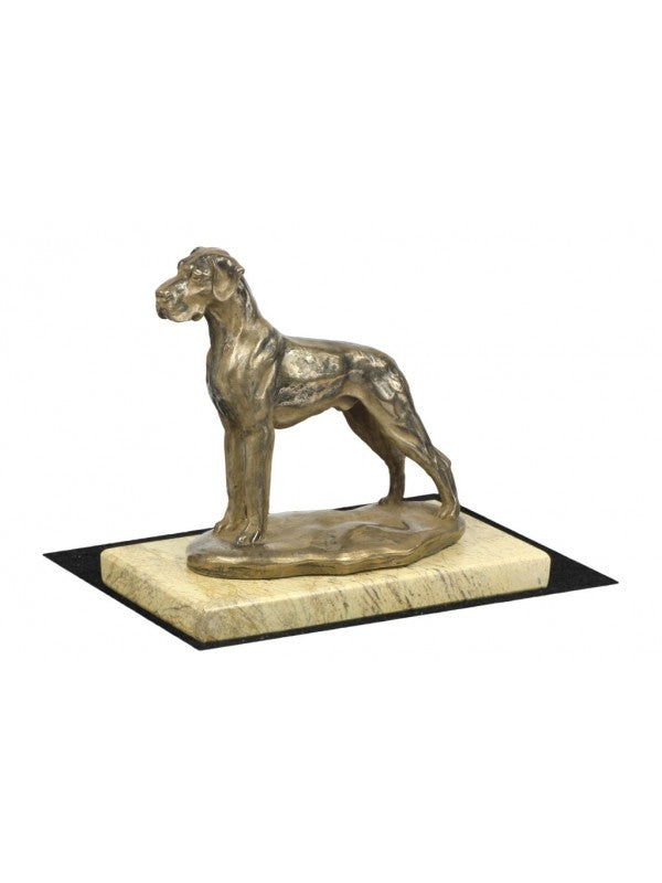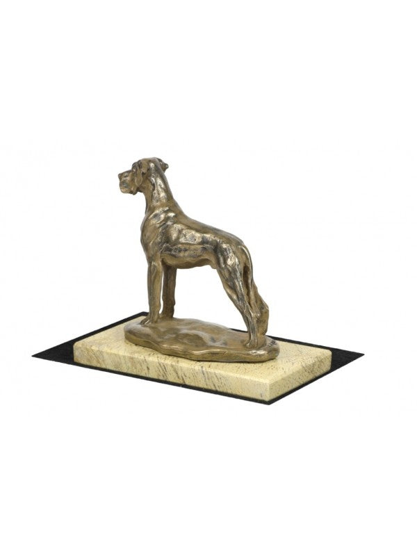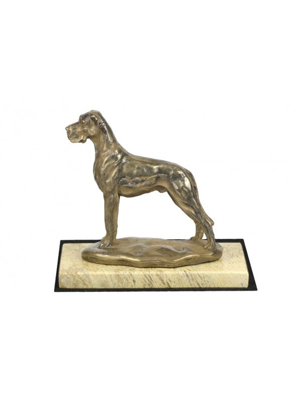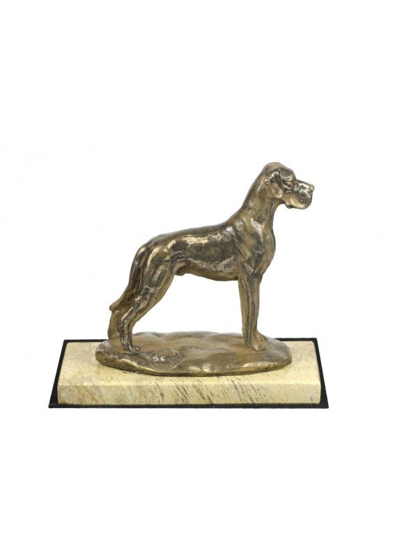 Handgjord Grand Danois-statyett i kallstöpt brons med interiör i stark kvarts ståendes på sandmarmor i begränsad upplaga.