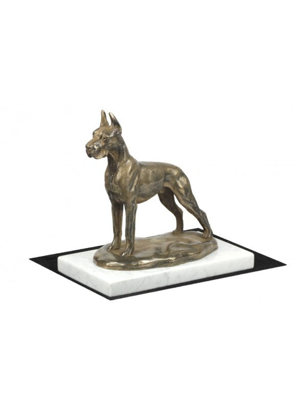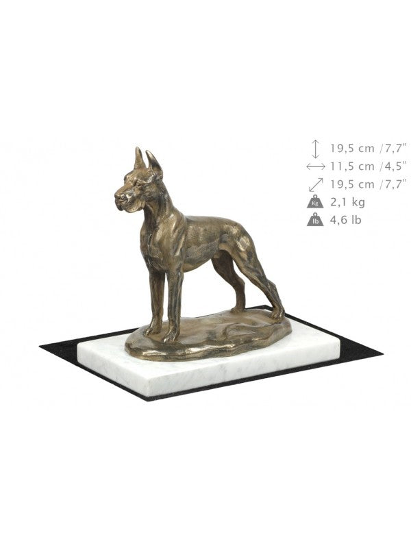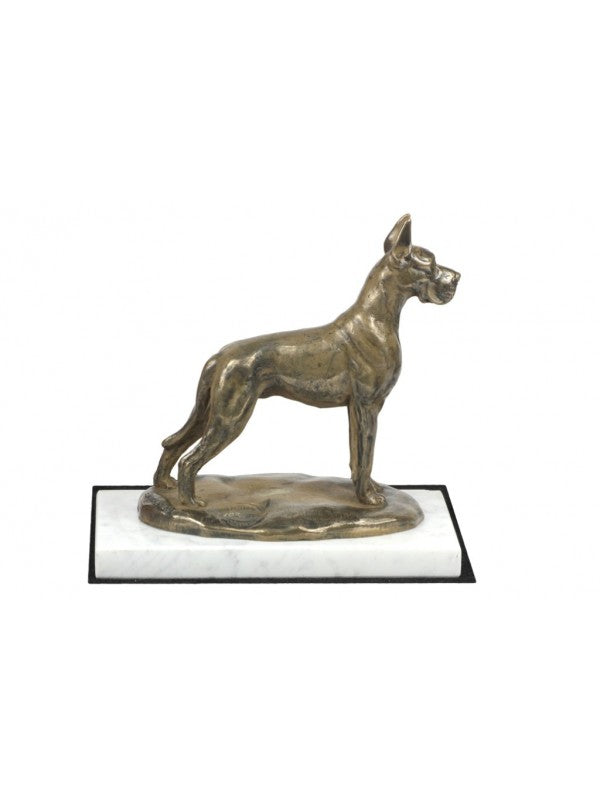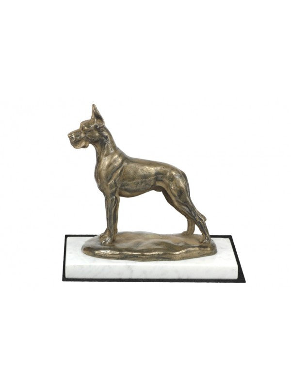 Handgjord Grand danois-statyetti kallstöpt brons med interiör i stark kvarts ståendes på vit marmor i begränsad upplaga.
