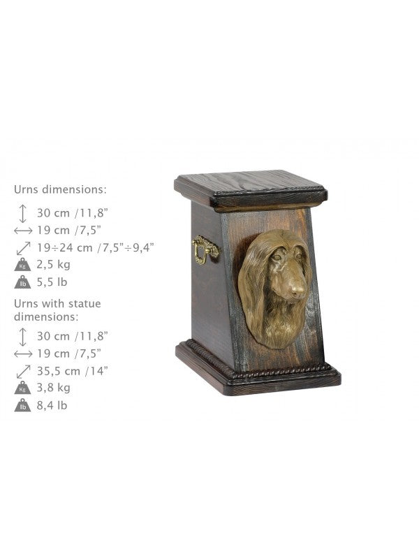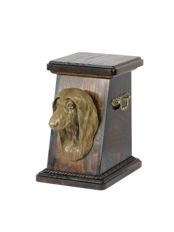 Handgjord Afghanhund-urna i björk med handtag i mässing och avtagbart lock. Noga utvalda kransformade detaljer. Statyett i kallstöpt brons med interiör i stark kvarts.