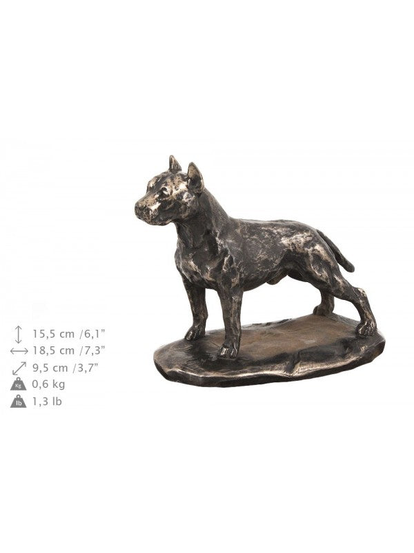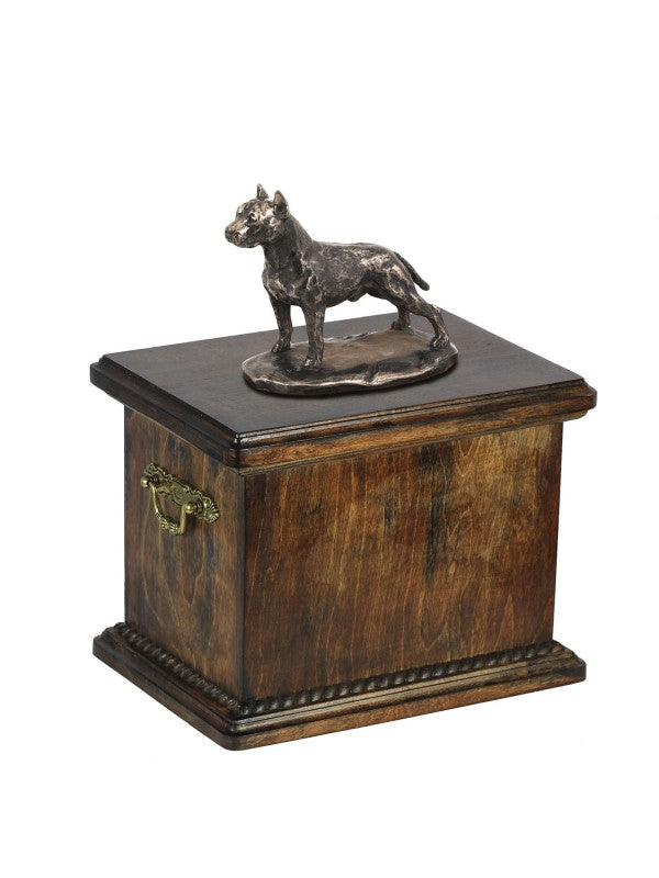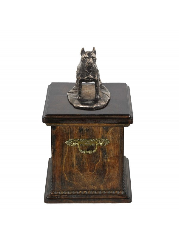 Handgjord American staffordshire terrier -urna i björk med handtag i mässing och avtagbart lock. Noga utvalda kransformade detaljer. Statyett i kallstöpt brons med interiör i stark kvarts.