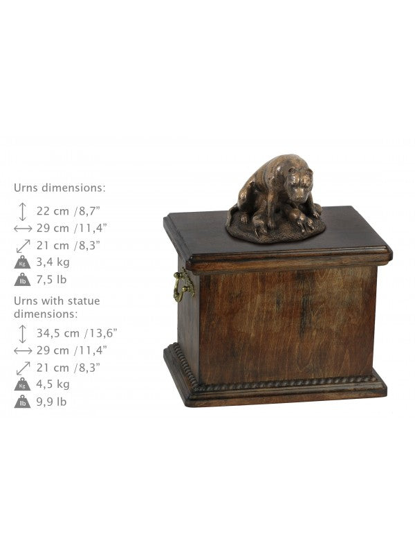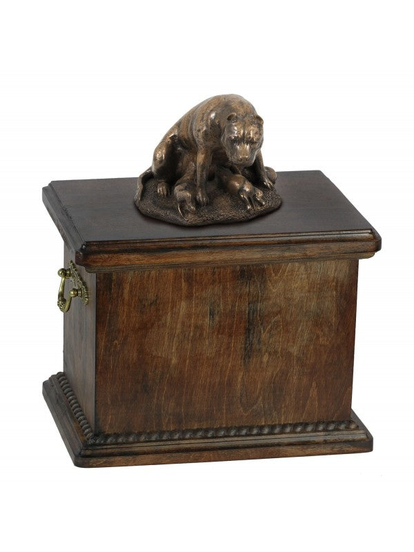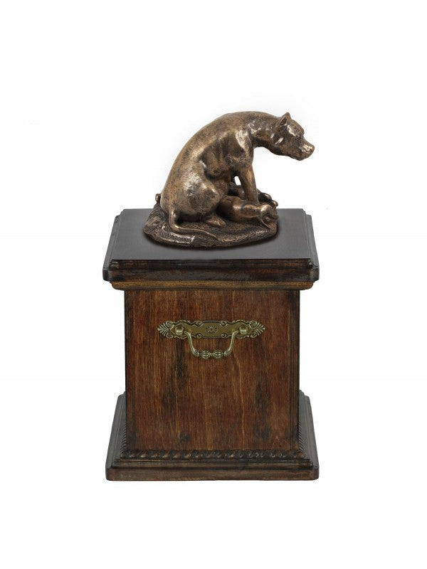 Handgjord American staffordshire terrier -urna i björk med handtag i mässing och avtagbart lock. Noga utvalda kransformade detaljer. Statyett i kallstöpt brons med interiör i stark kvarts.
