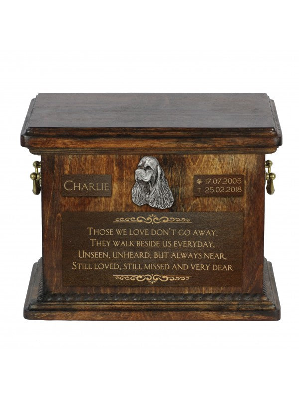 Handgjord Amerikansk cocker spaniel-urna i björk med handtag i mässing och avtagbart lock. Noga utvalda kransformade detaljer.