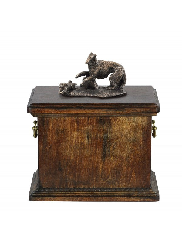 Handgjord Barzoï rysk varghund-urna i björk med handtag i mässing och avtagbart lock. Noga utvalda kransformade detaljer. Statyett i kallstöpt brons med interiör i stark kvarts.