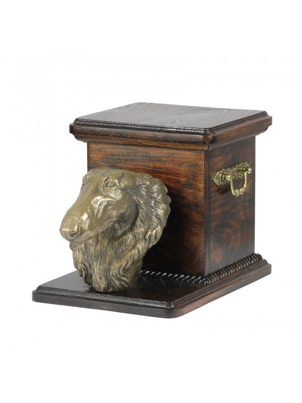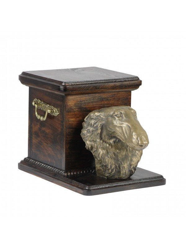 Handgjord Barzoï rysk varghund-urna i björk med handtag i mässing och avtagbart lock. Noga utvalda kransformade detaljer. Statyett i kallstöpt brons med interiör i stark kvarts.