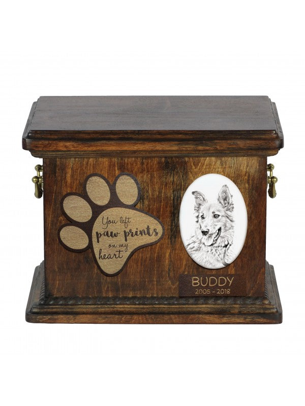 Handgjord Baskisk herdehund-urna i björk med ingraverad keramikplatta, handtag i mässing och avtagbart lock. Noga utvalda kransformade detaljer.