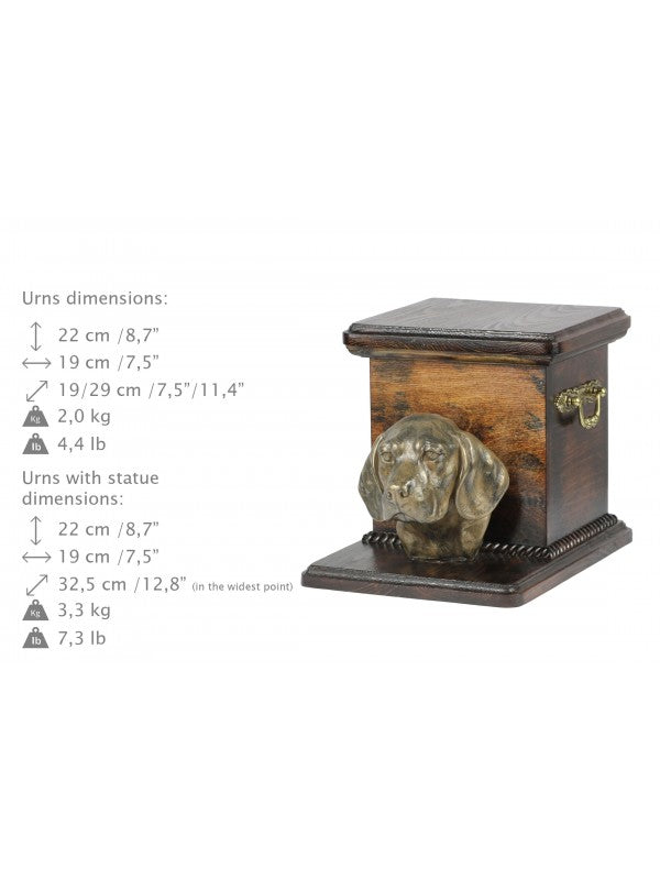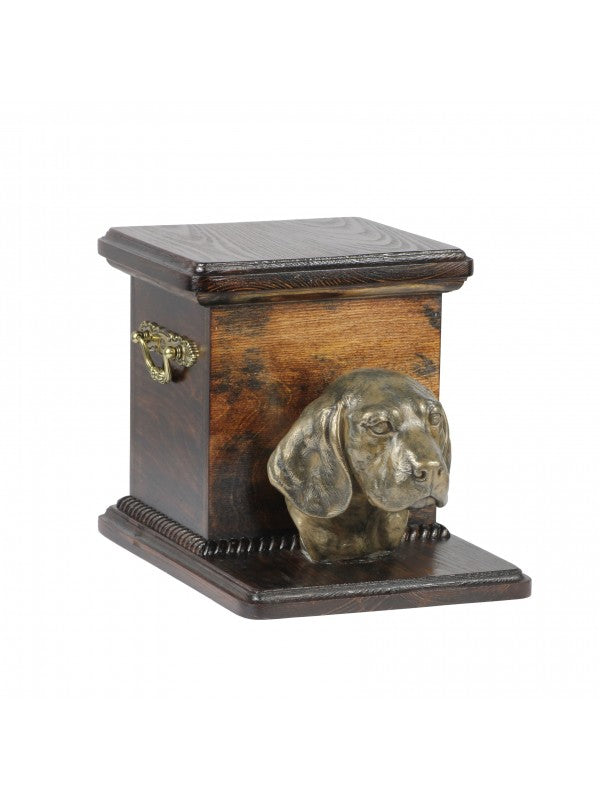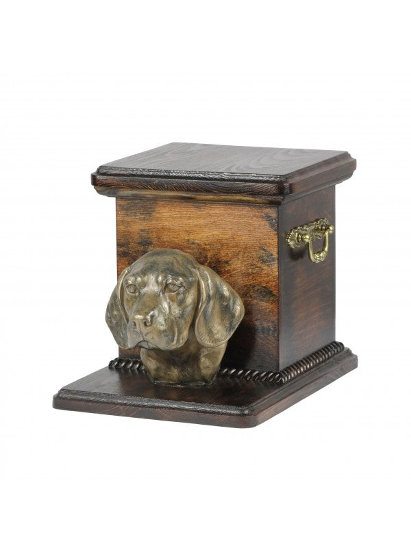 Handgjord Beagle-urna i björk med handtag i mässing och avtagbart lock. Noga utvalda kransformade detaljer. Statyett i kallstöpt brons med interiör i stark kvarts.