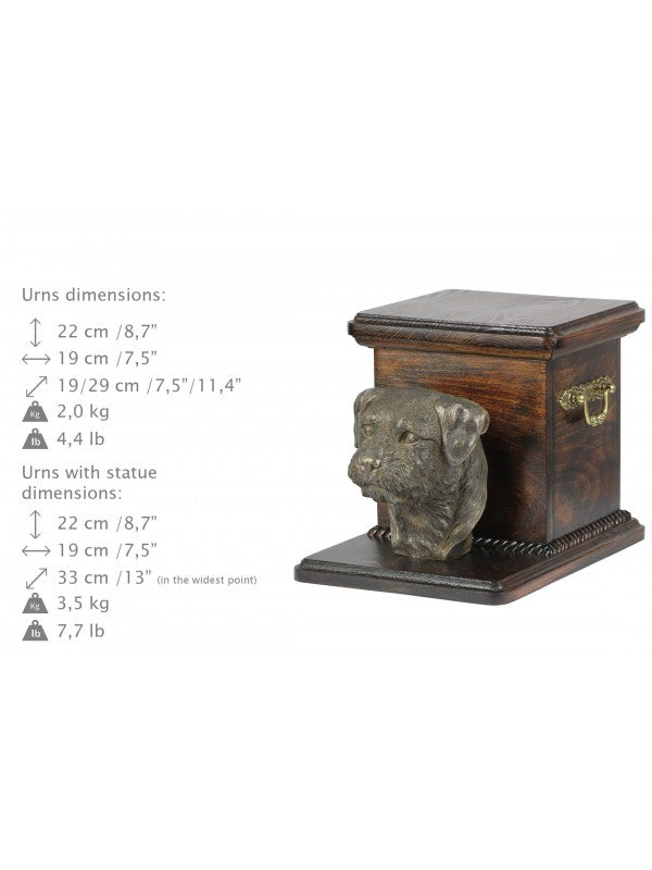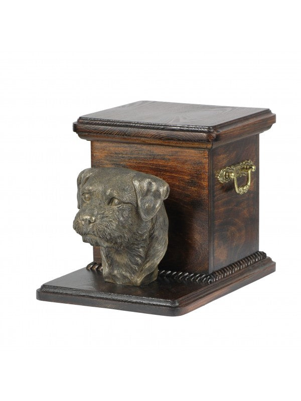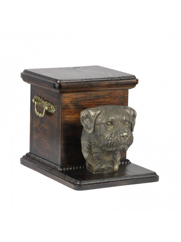 Handgjord Borderterrier-urna i björk med handtag i mässing och avtagbart lock. Noga utvalda kransformade detaljer. Statyett i kallstöpt brons med interiör i stark kvarts.