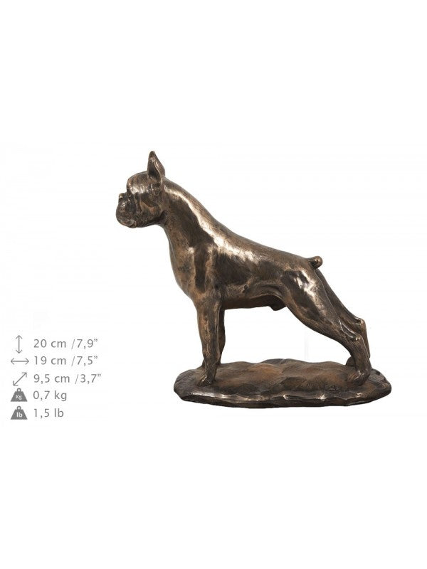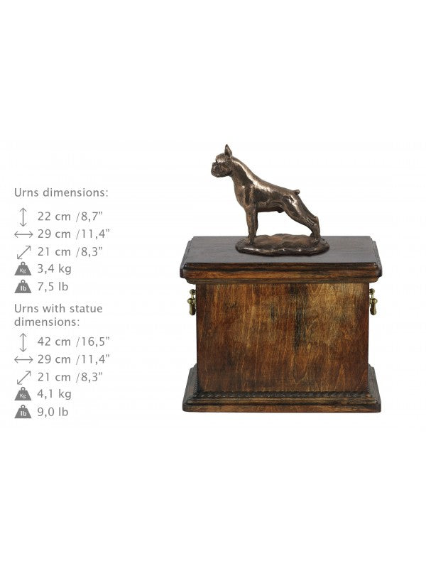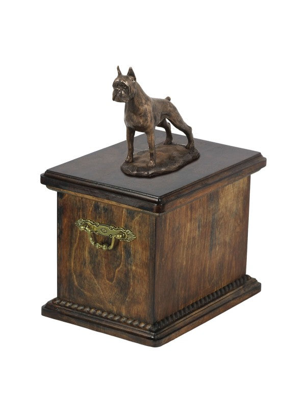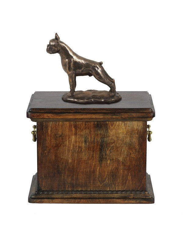 Handgjord Boxer-urna i björk med handtag i mässing och avtagbart lock. Noga utvalda kransformade detaljer. Statyett i kallstöpt brons med interiör i stark kvarts.