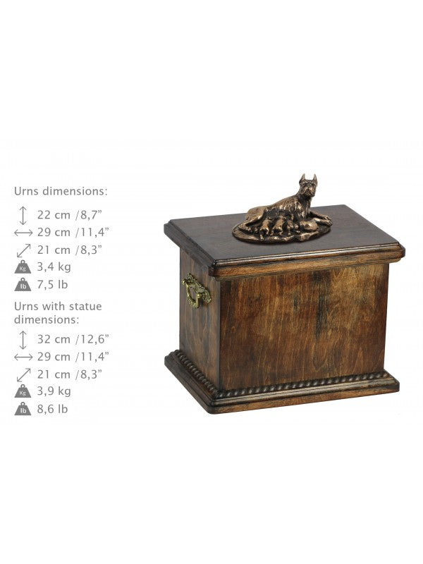Handgjord Boxer-urna i björk med handtag i mässing och avtagbart lock. Noga utvalda kransformade detaljer. Statyett i kallstöpt brons med interiör i stark kvarts.