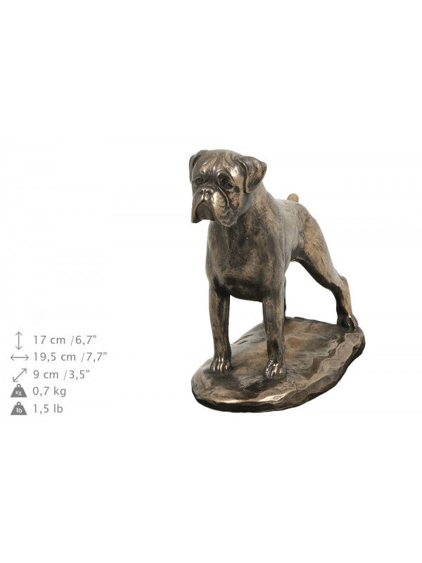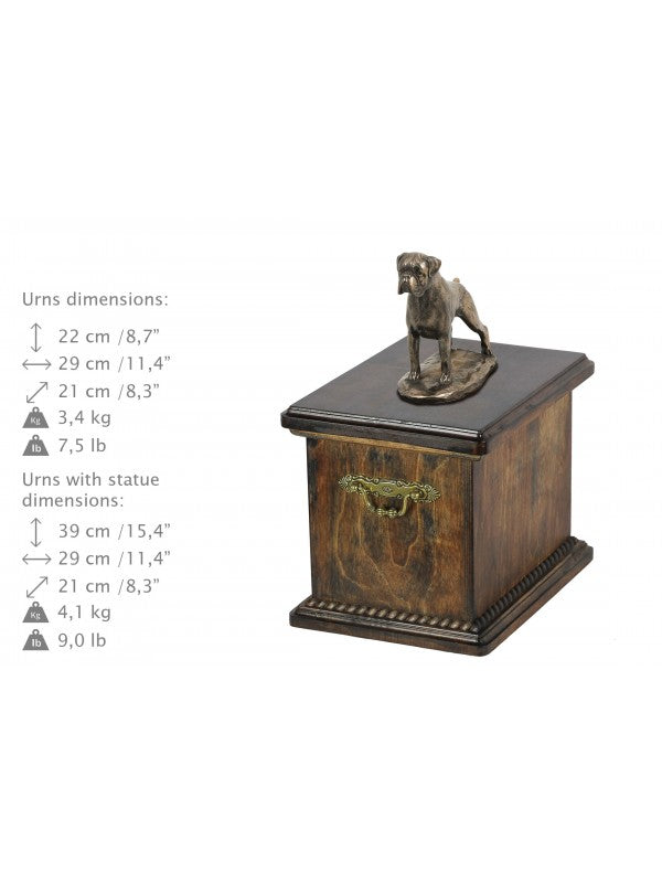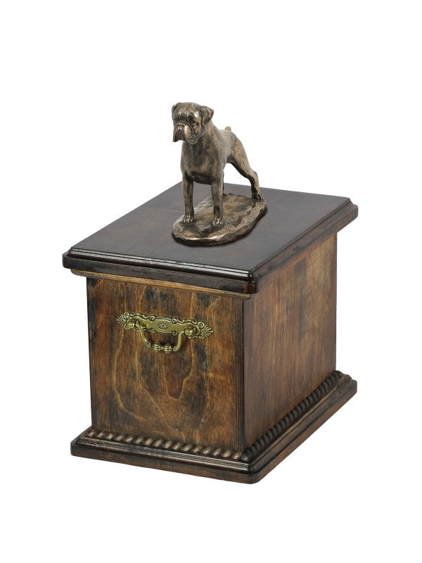 Handgjord Boxer-urna i björk med handtag i mässing och avtagbart lock. Noga utvalda kransformade detaljer. Statyett i kallstöpt brons med interiör i stark kvarts.