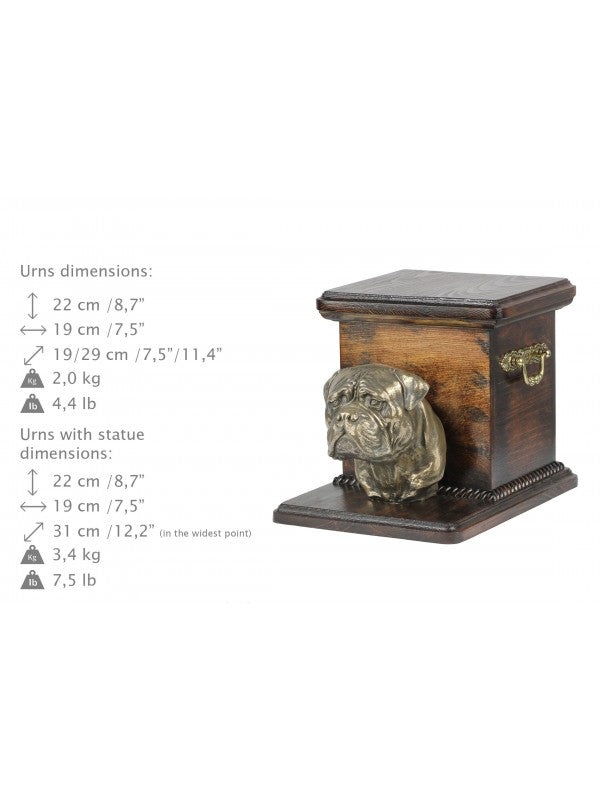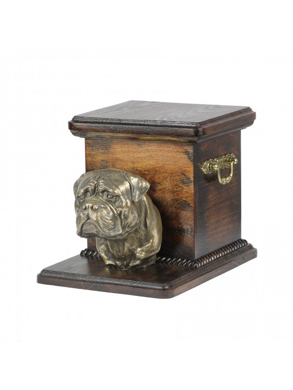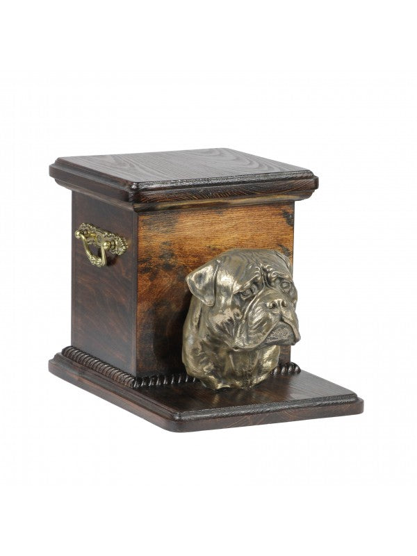 Handgjord Bullmastiff-urna i björk med handtag i mässing och avtagbart lock. Noga utvalda kransformade detaljer. Statyett i kallstöpt brons med interiör i stark kvarts.